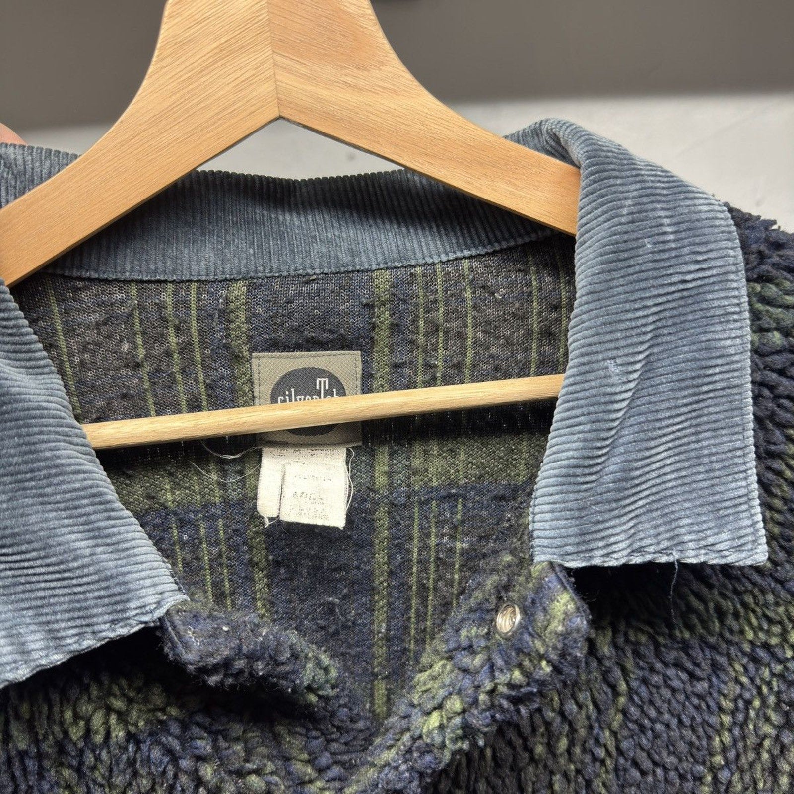 Super cozy, slight pilling and general wear. Perfect blue/green grunge plaid. Missing snap on left cuff. So good.
