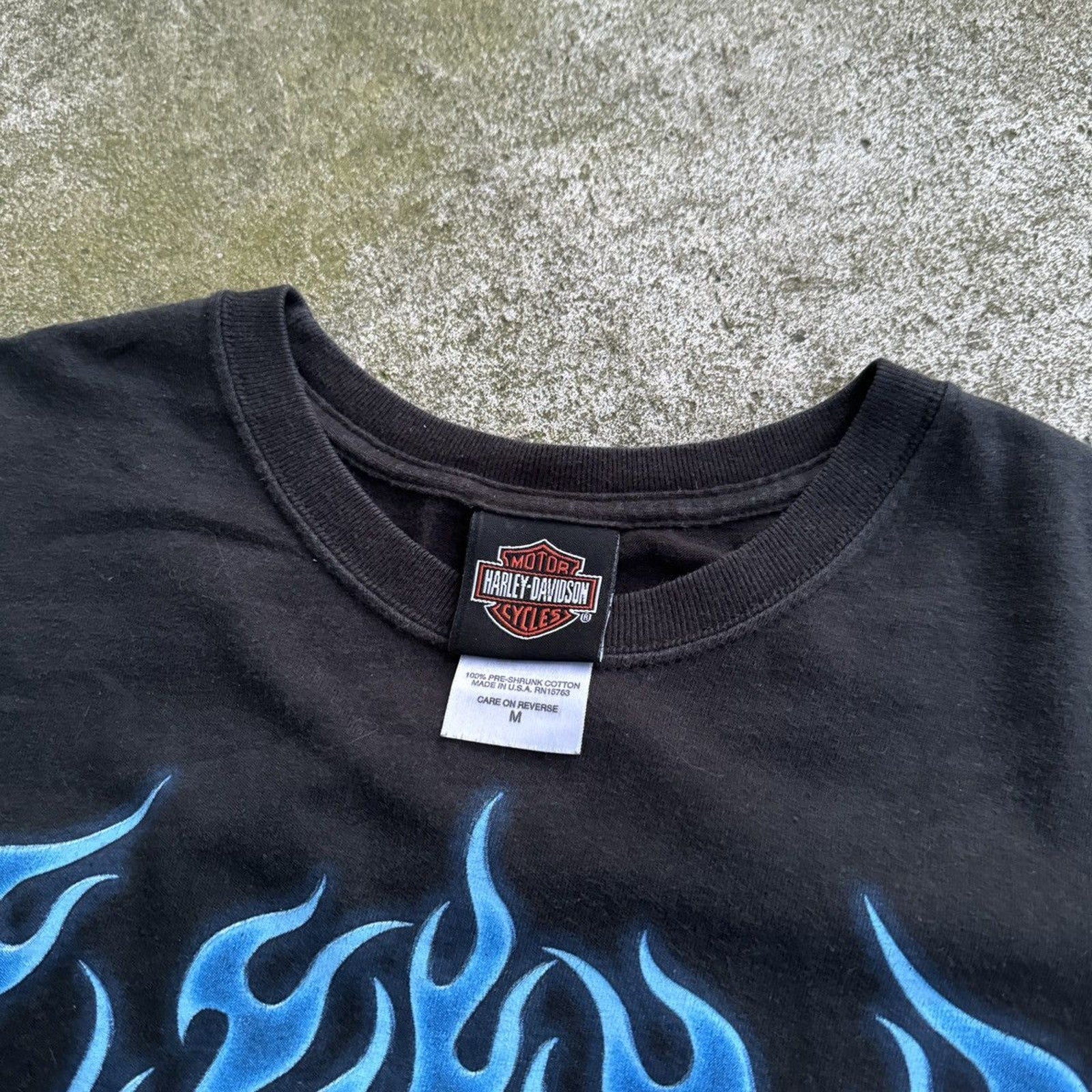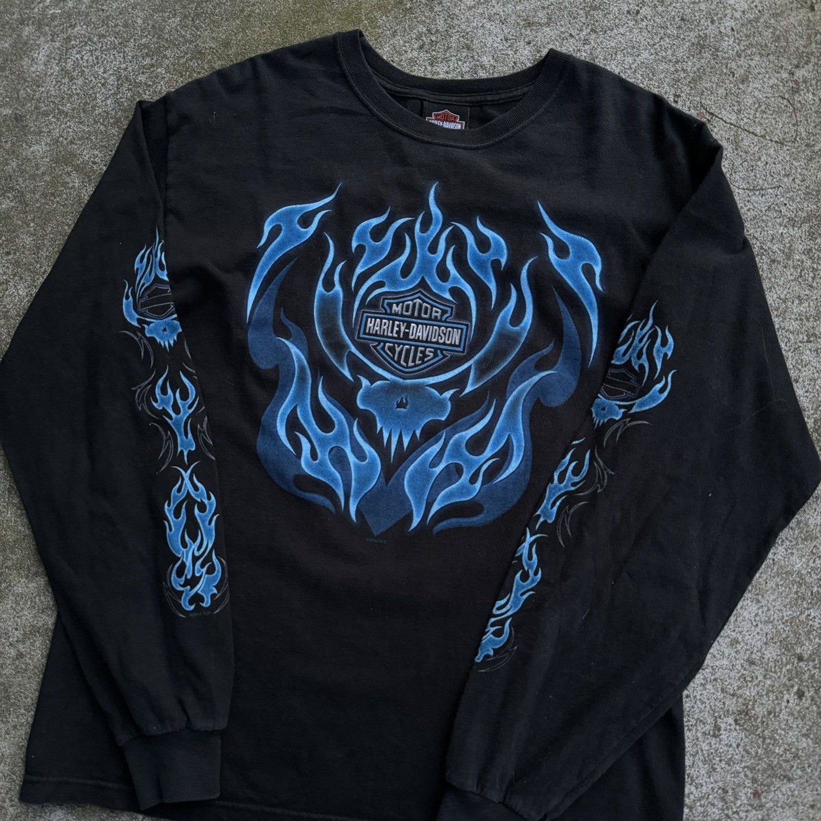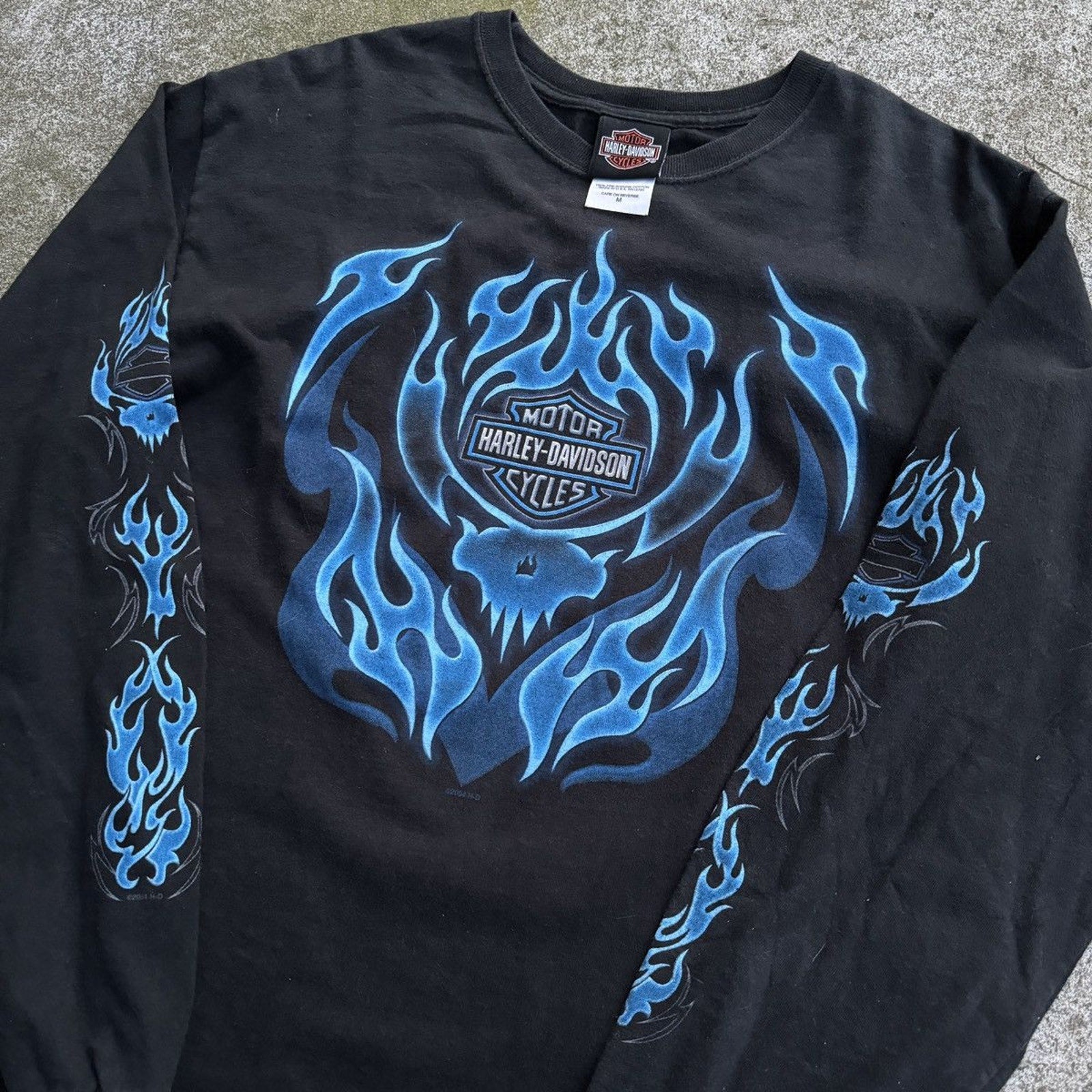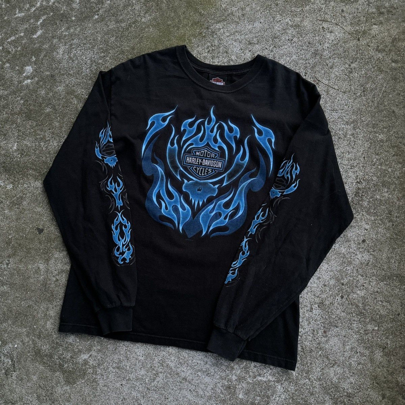 CAMISETA DE MANGA LARGA HARLEY DAVIDSON CON CALAVERA AZUL Y LLAMAS DE LA DÉCADA DE 2000, VIRGINIA BEACH