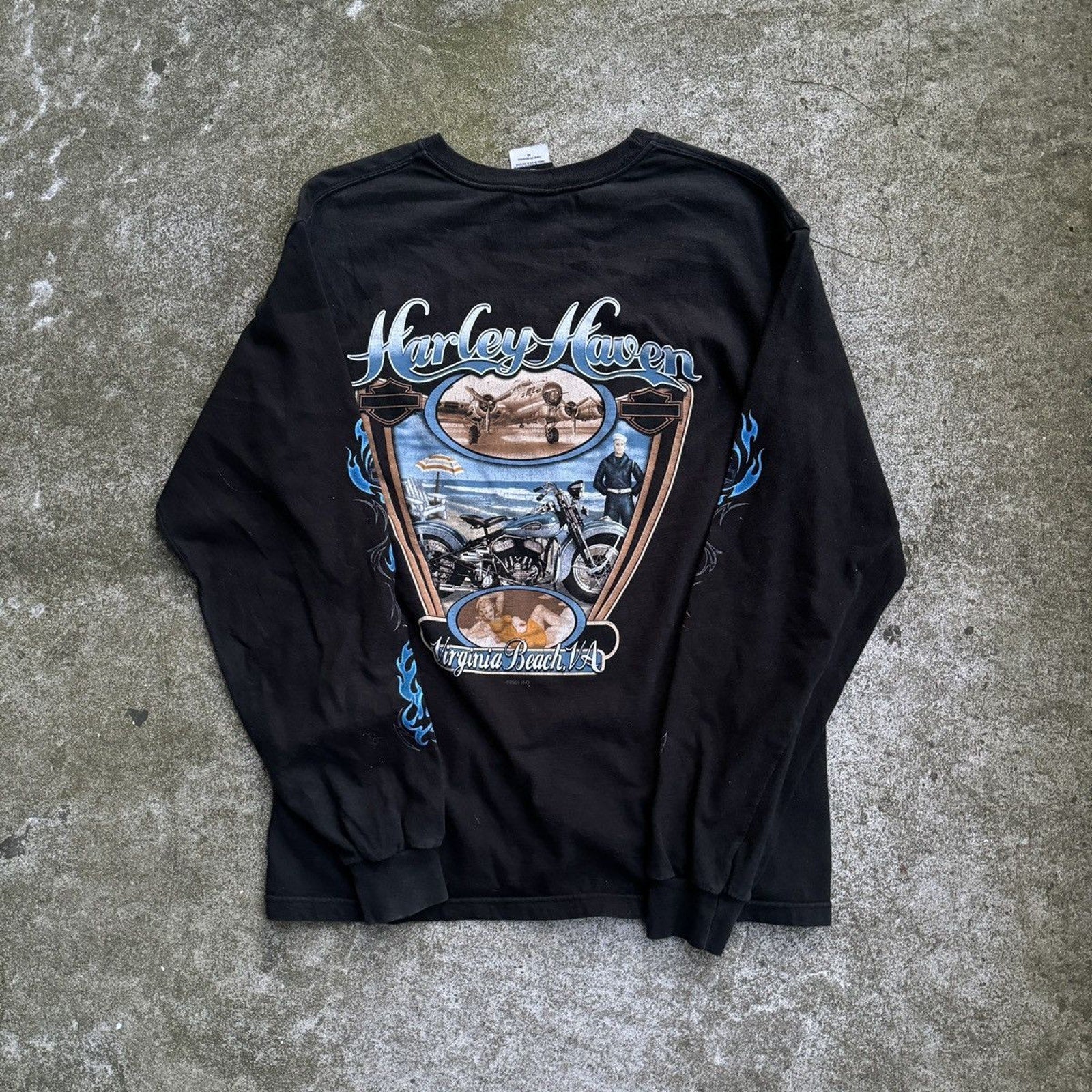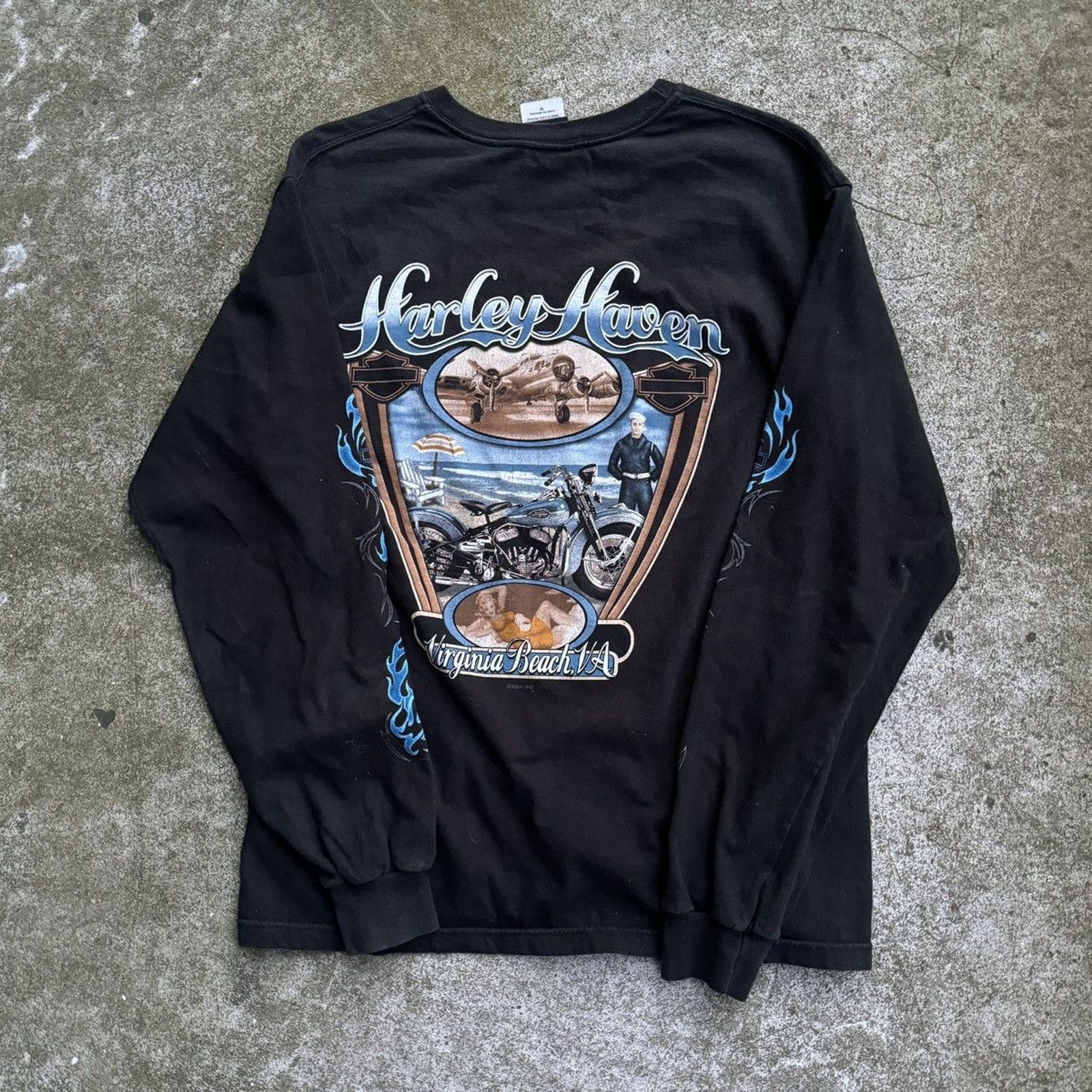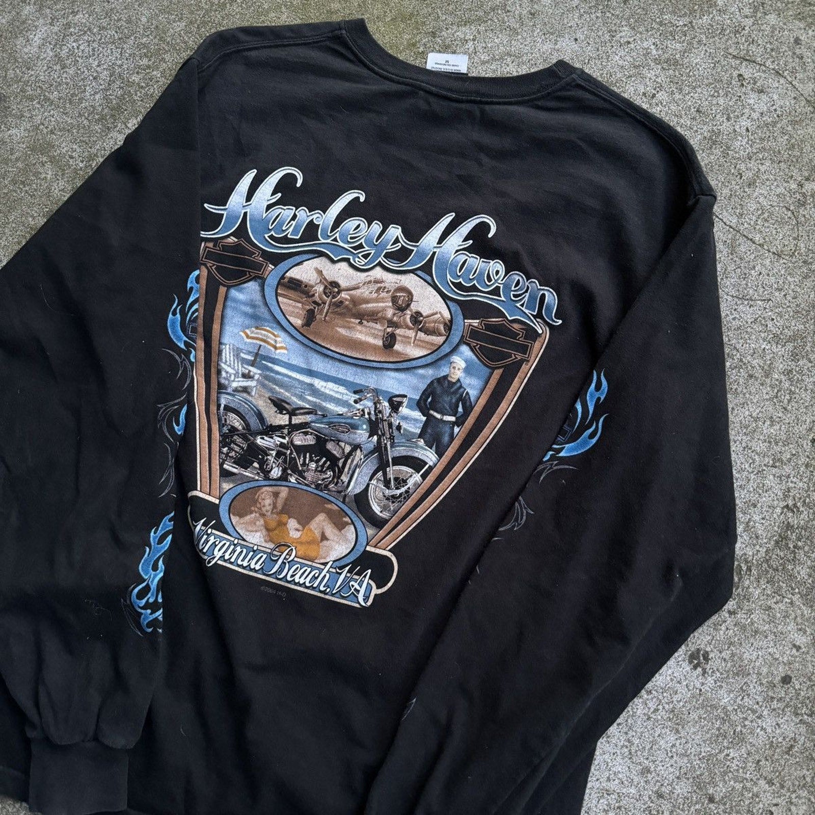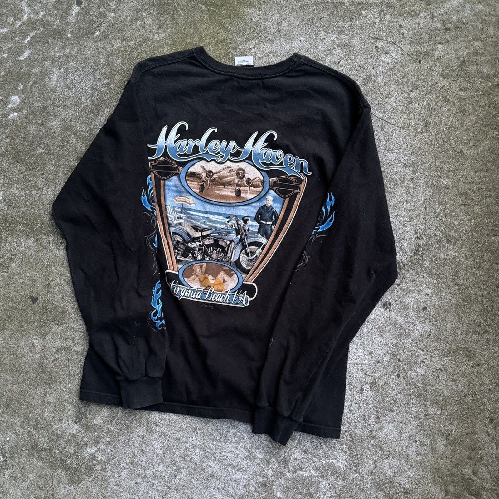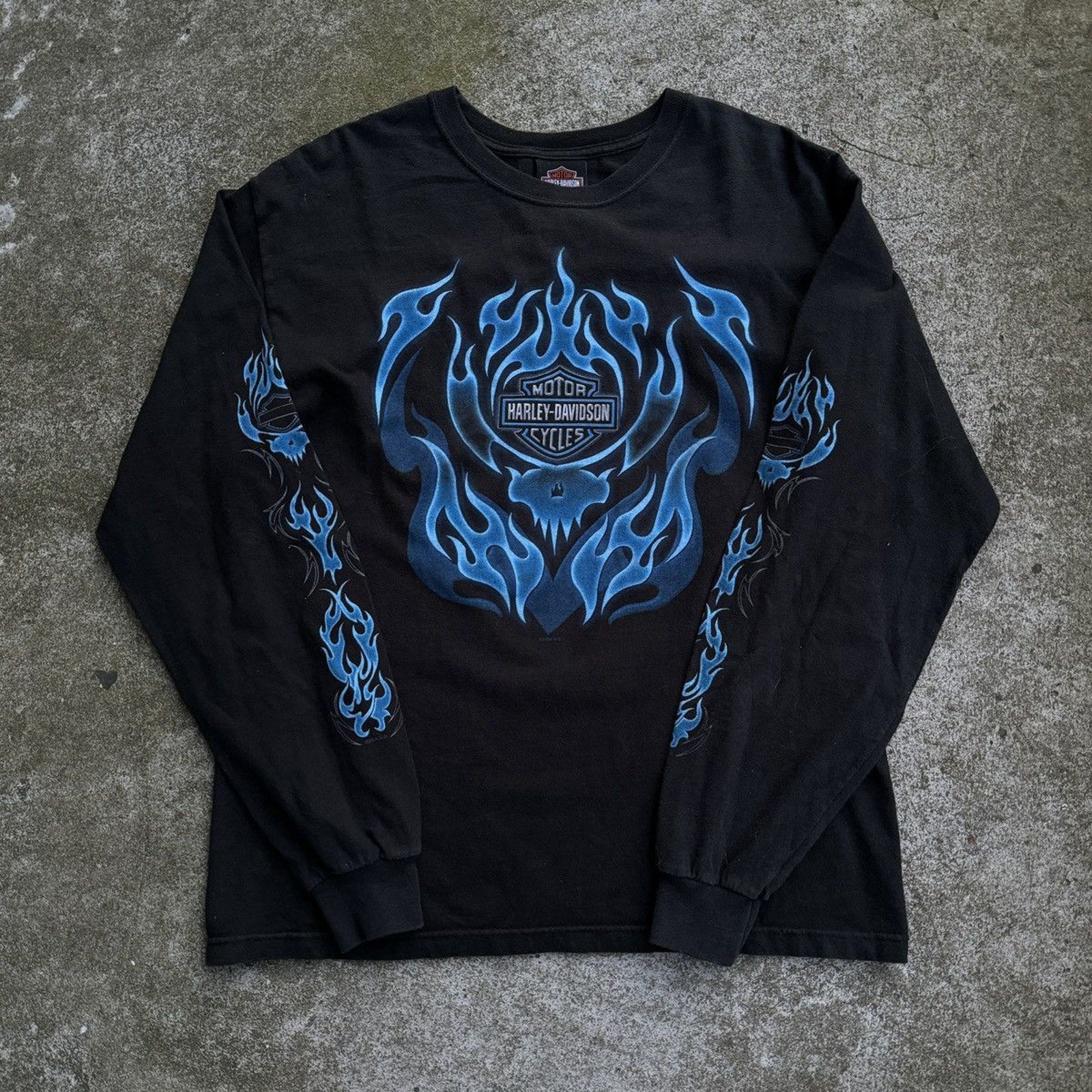 CAMISETA DE MANGA LARGA HARLEY DAVIDSON CON CALAVERA AZUL Y LLAMAS DE LA DÉCADA DE 2000, VIRGINIA BEACH