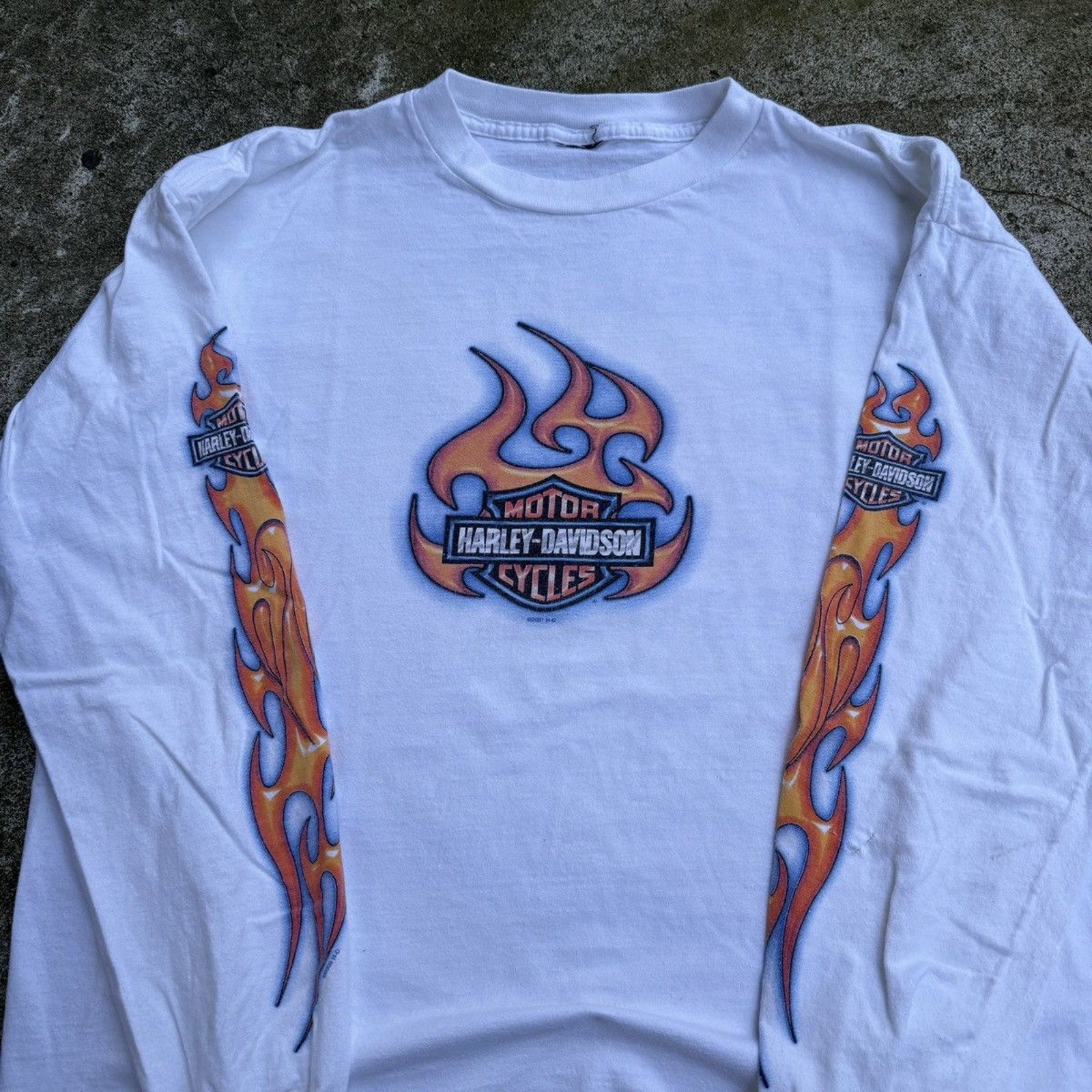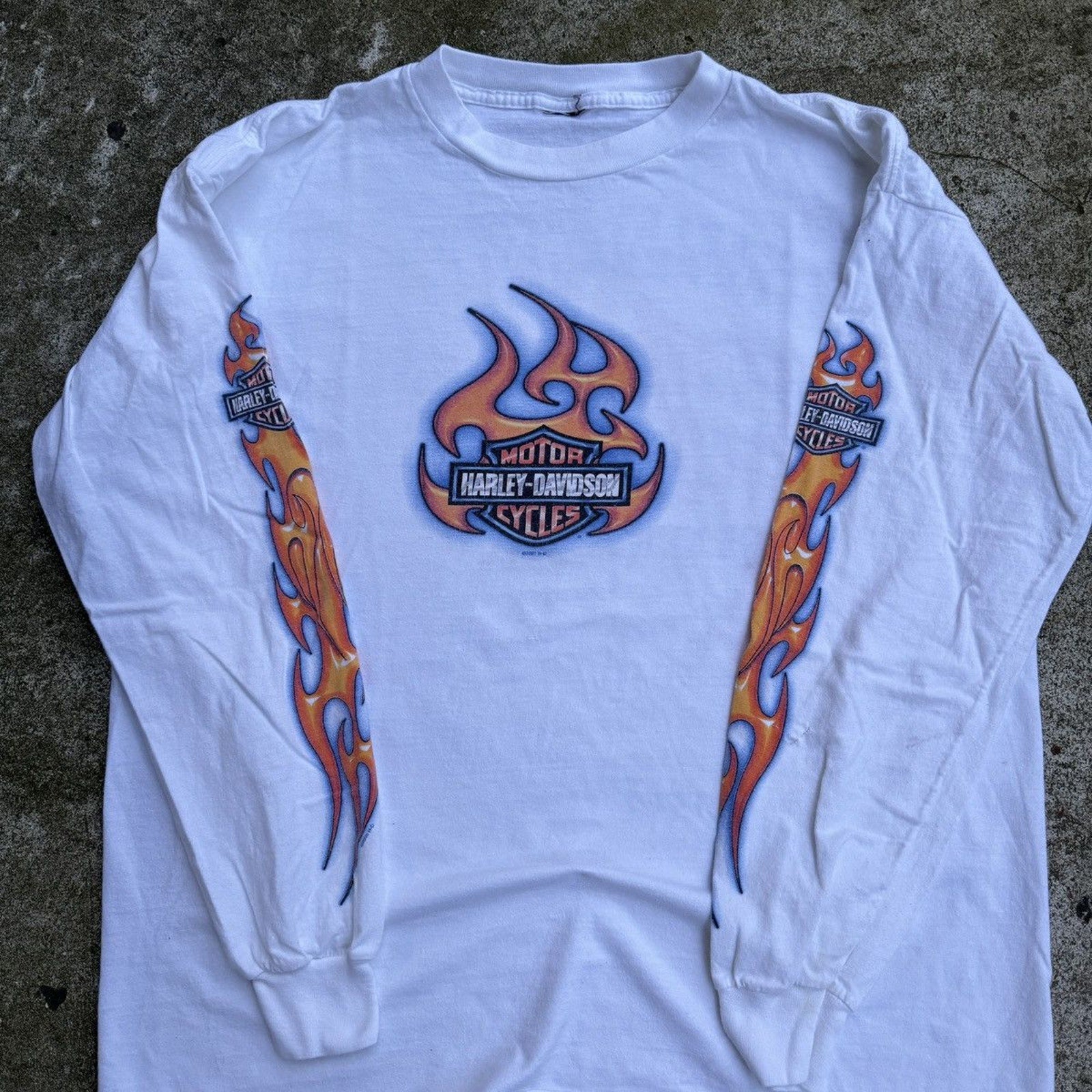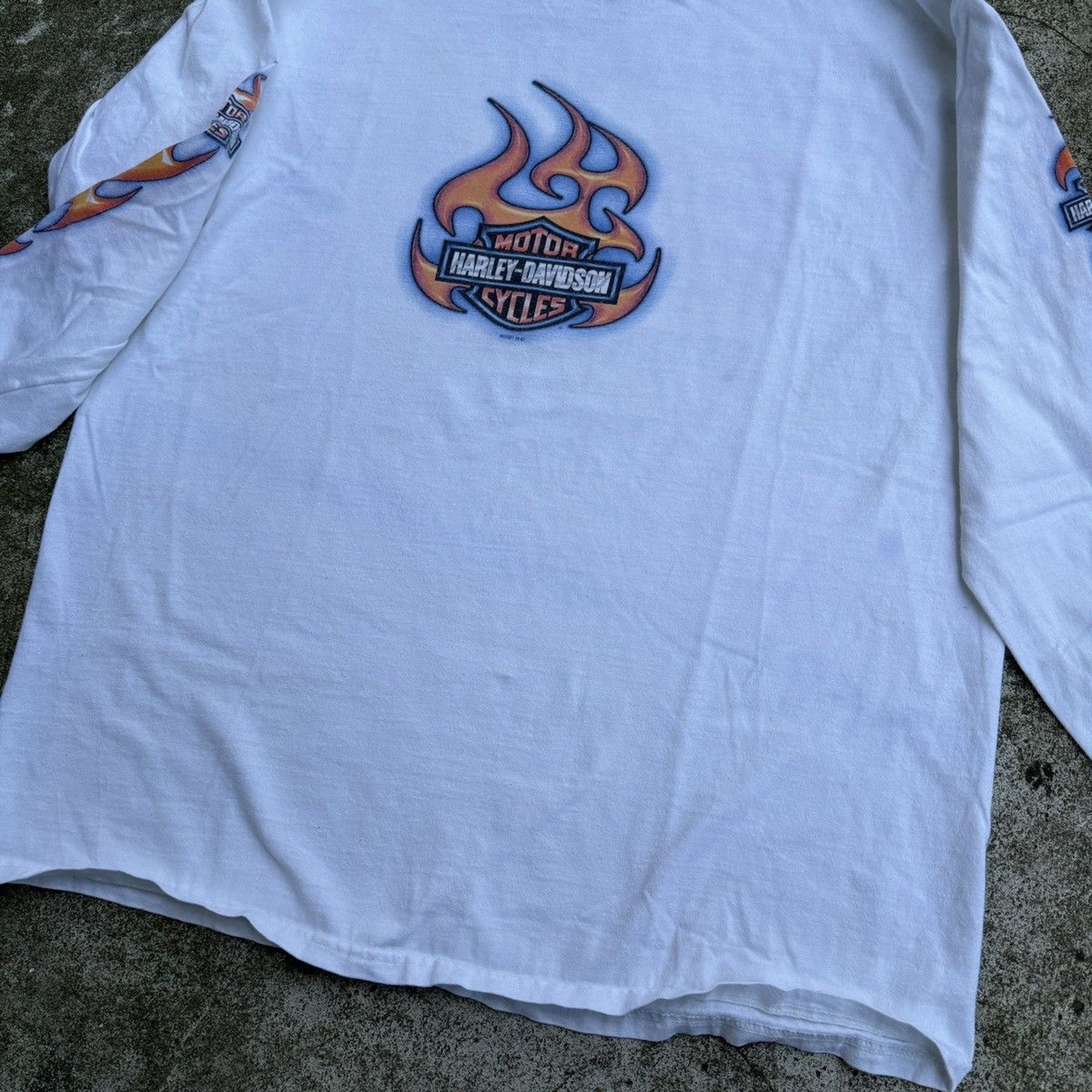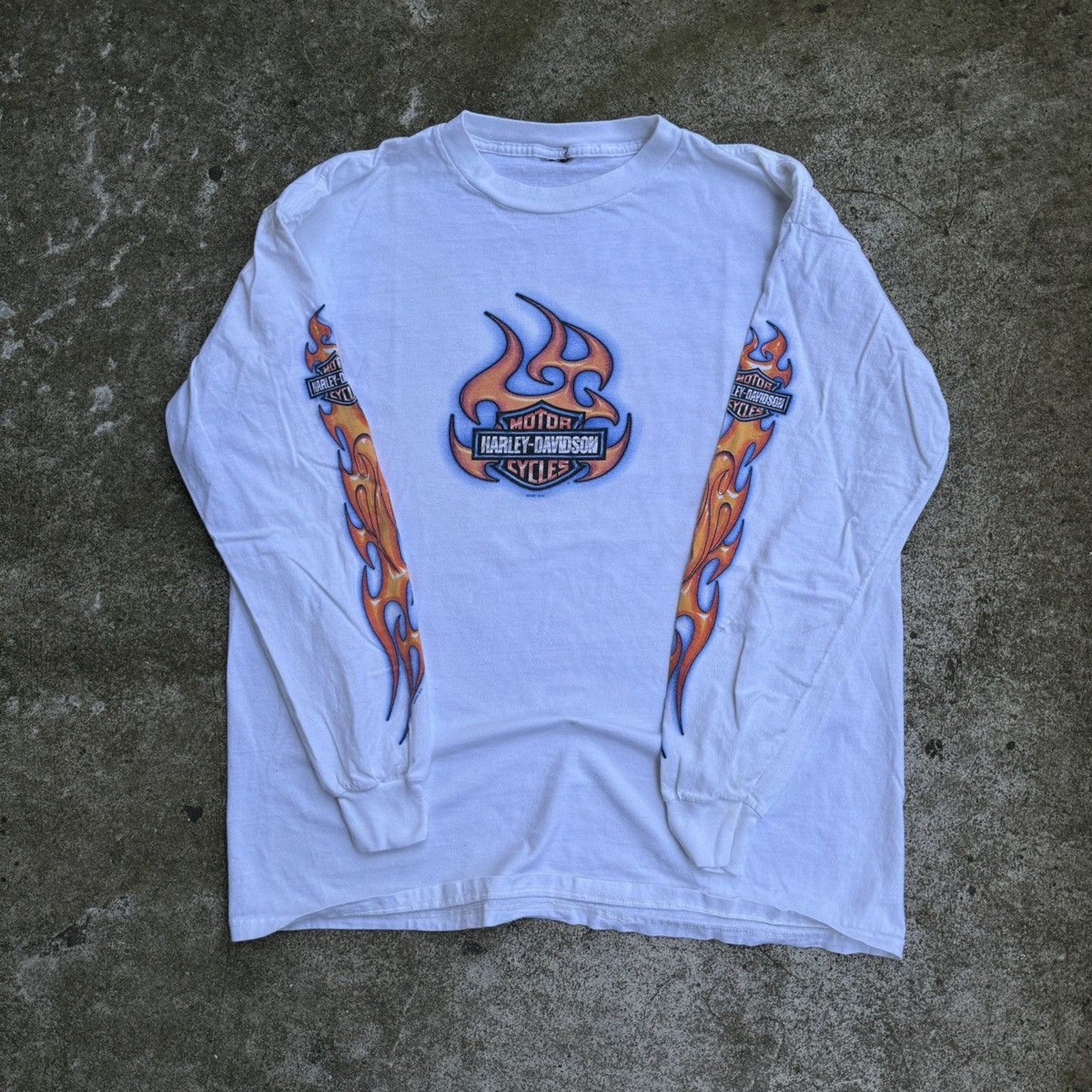 CAMISETA DE MANGA LARGA CON LOGO DE LLAMA DE HARLEY DAVIDSON DE LOS AÑOS 2000 DESGASTADO Y THRASHED