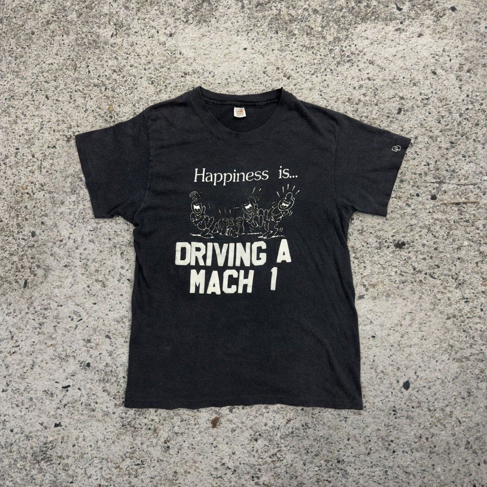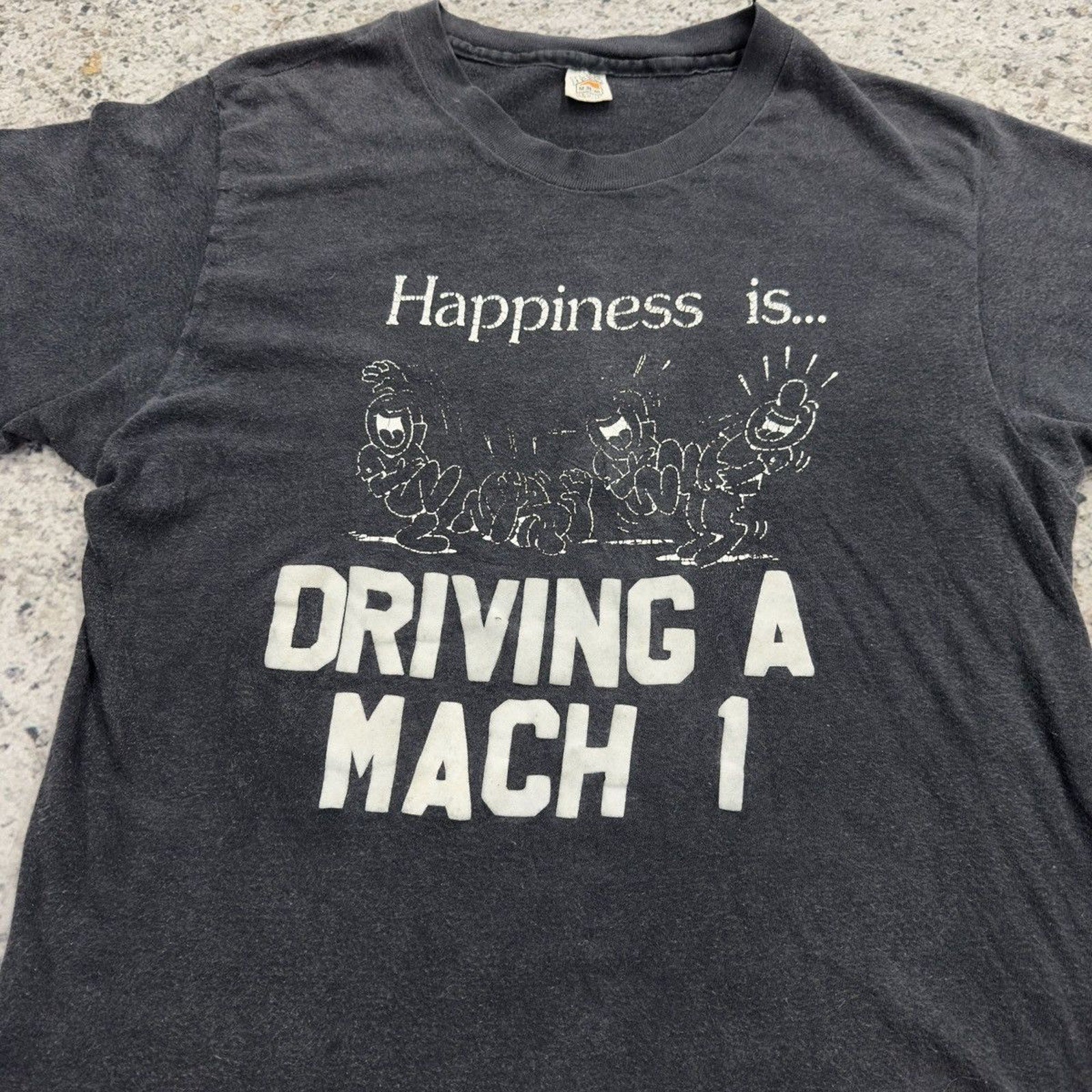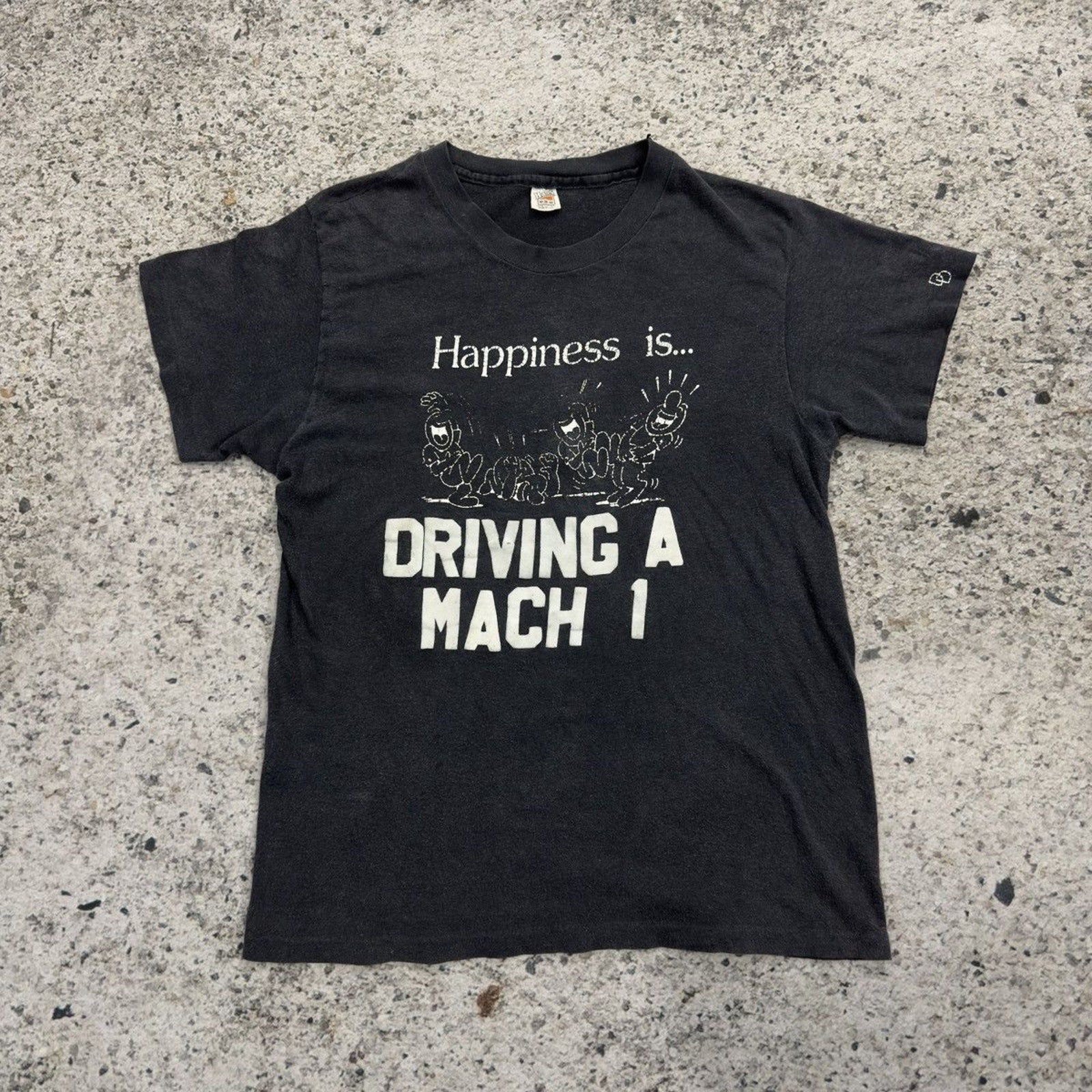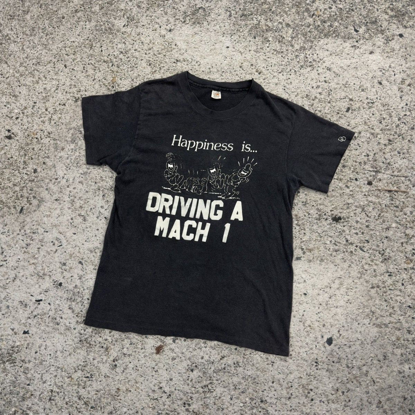1970s Faded Happiness Is Driving A Mach 1 Flock Print Tee