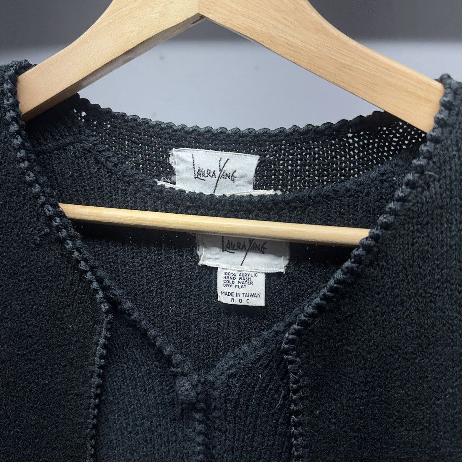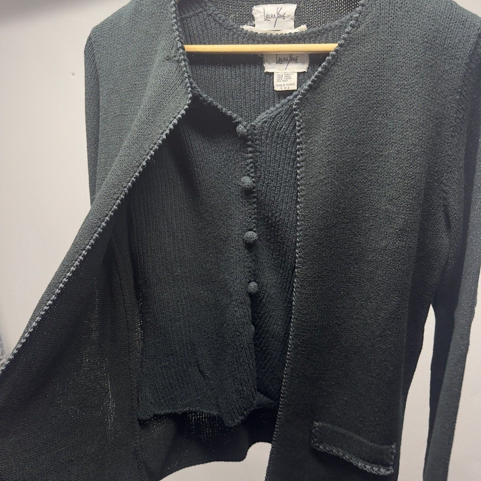 Perfect twinset cardigan sweater. sewn together, can be unsewn easily. acrylic knit. gorgeous look. love this one. so good. excellent overall condition