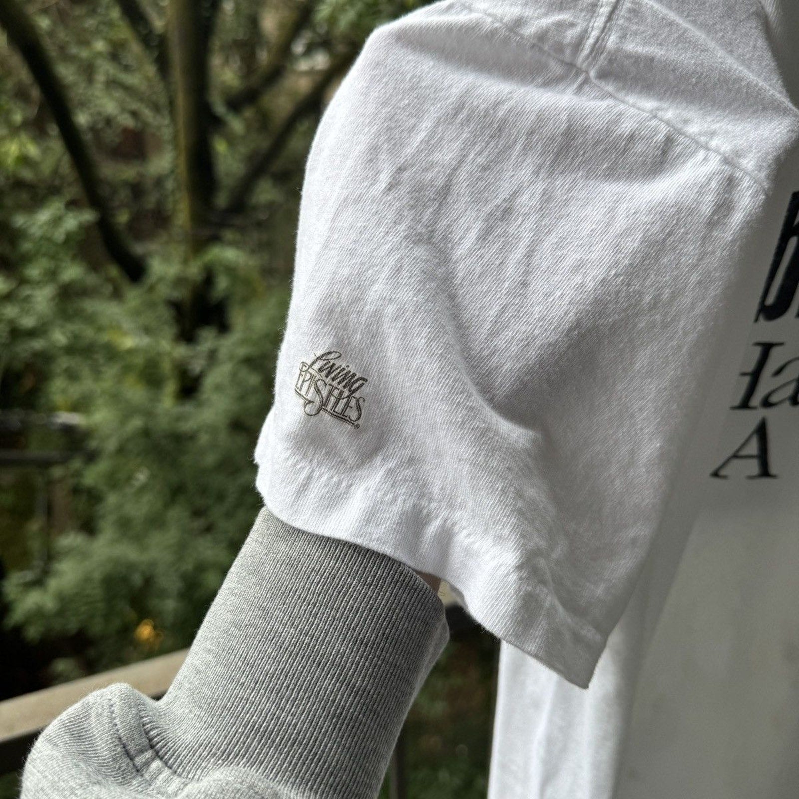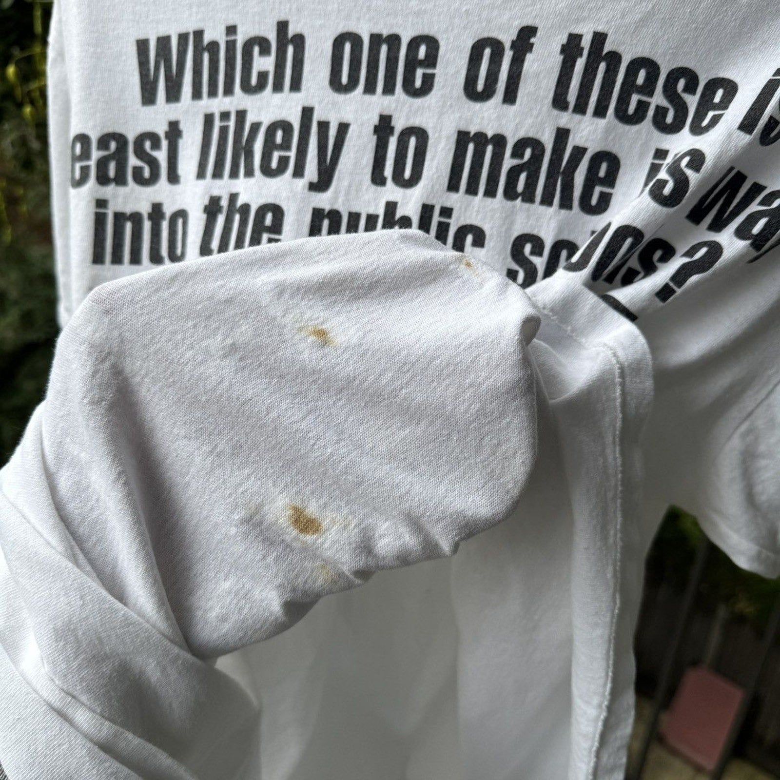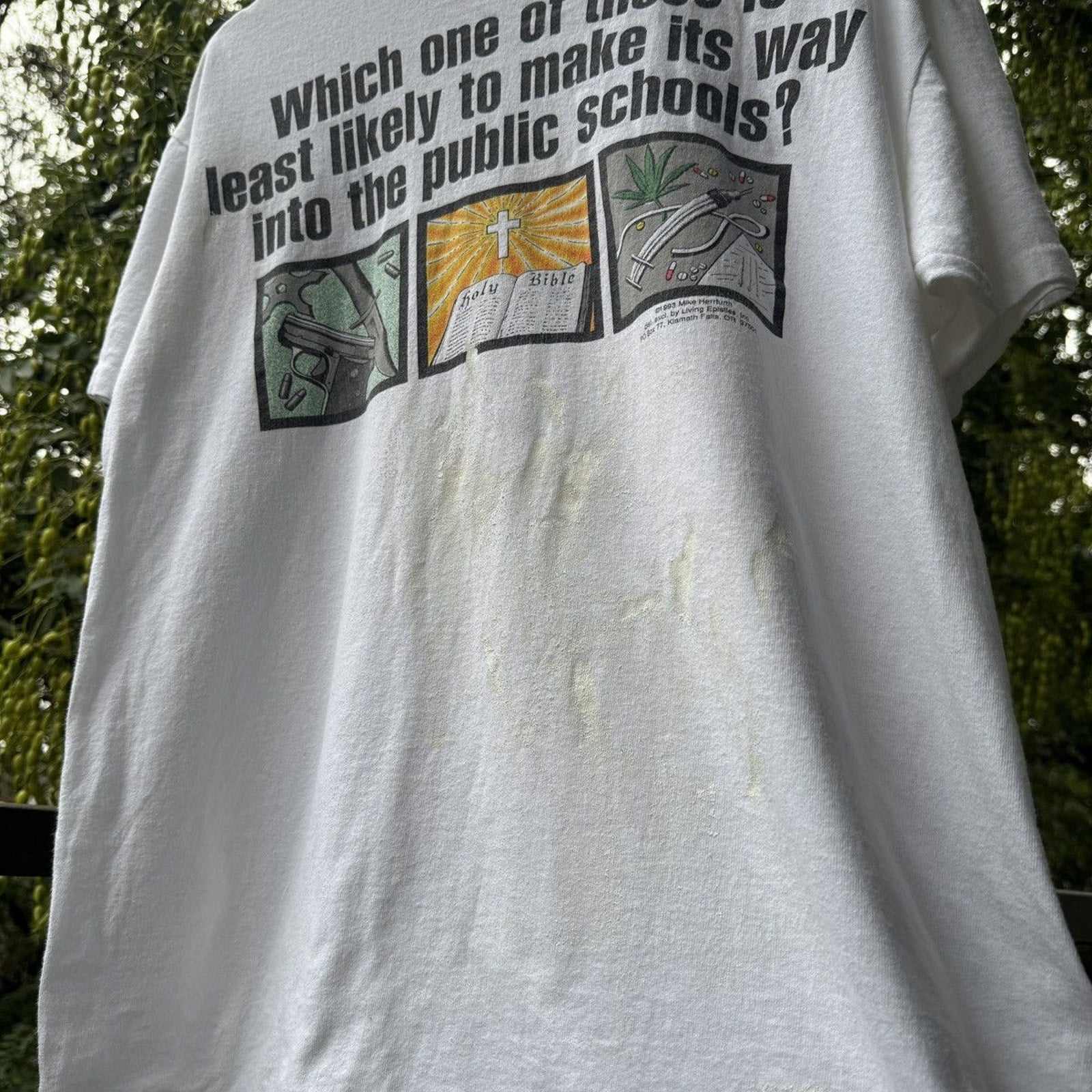 marked up with paint. some oil stains underneath, can see through the inside of shirt only. looks sick. so so rare. so good. living epistles shirt.