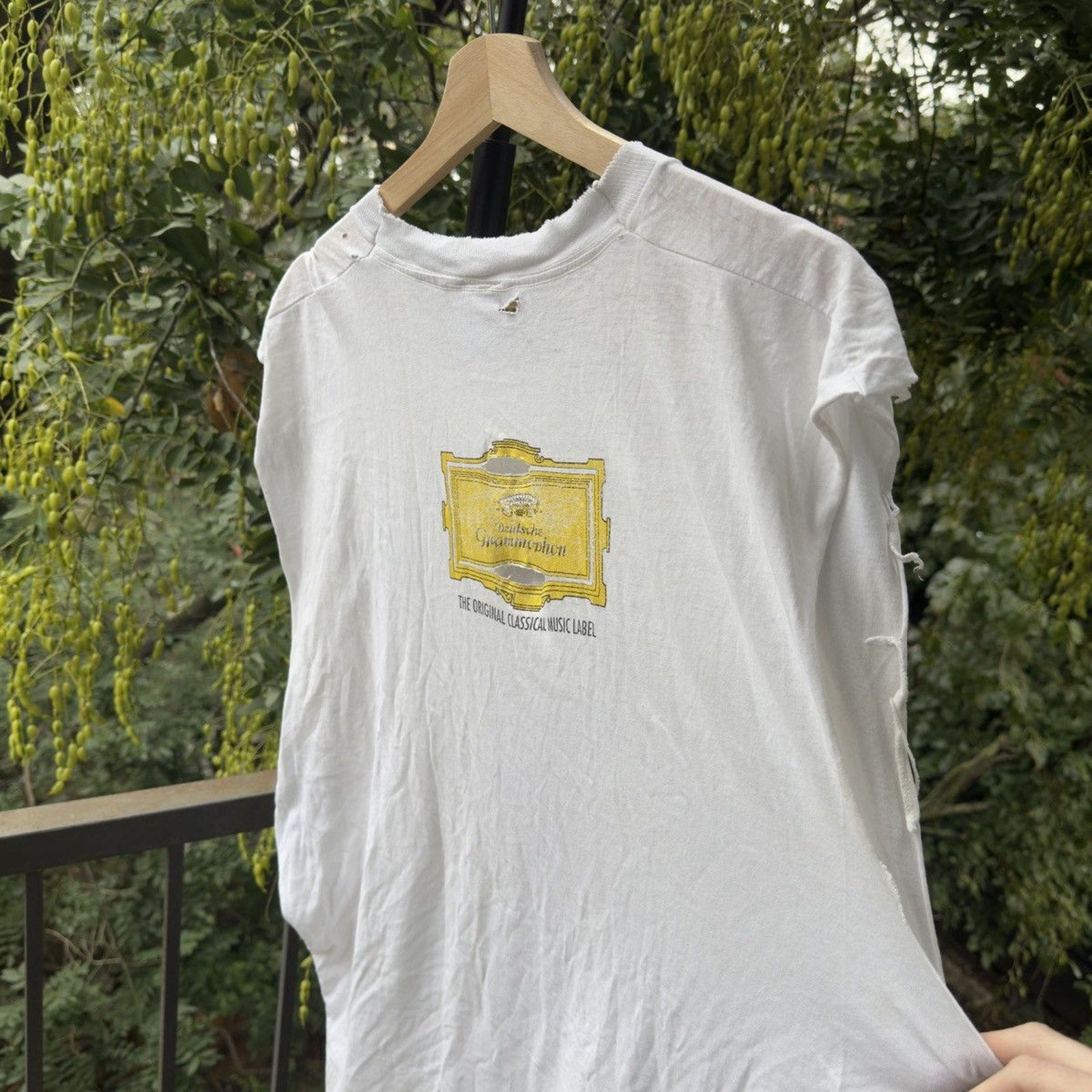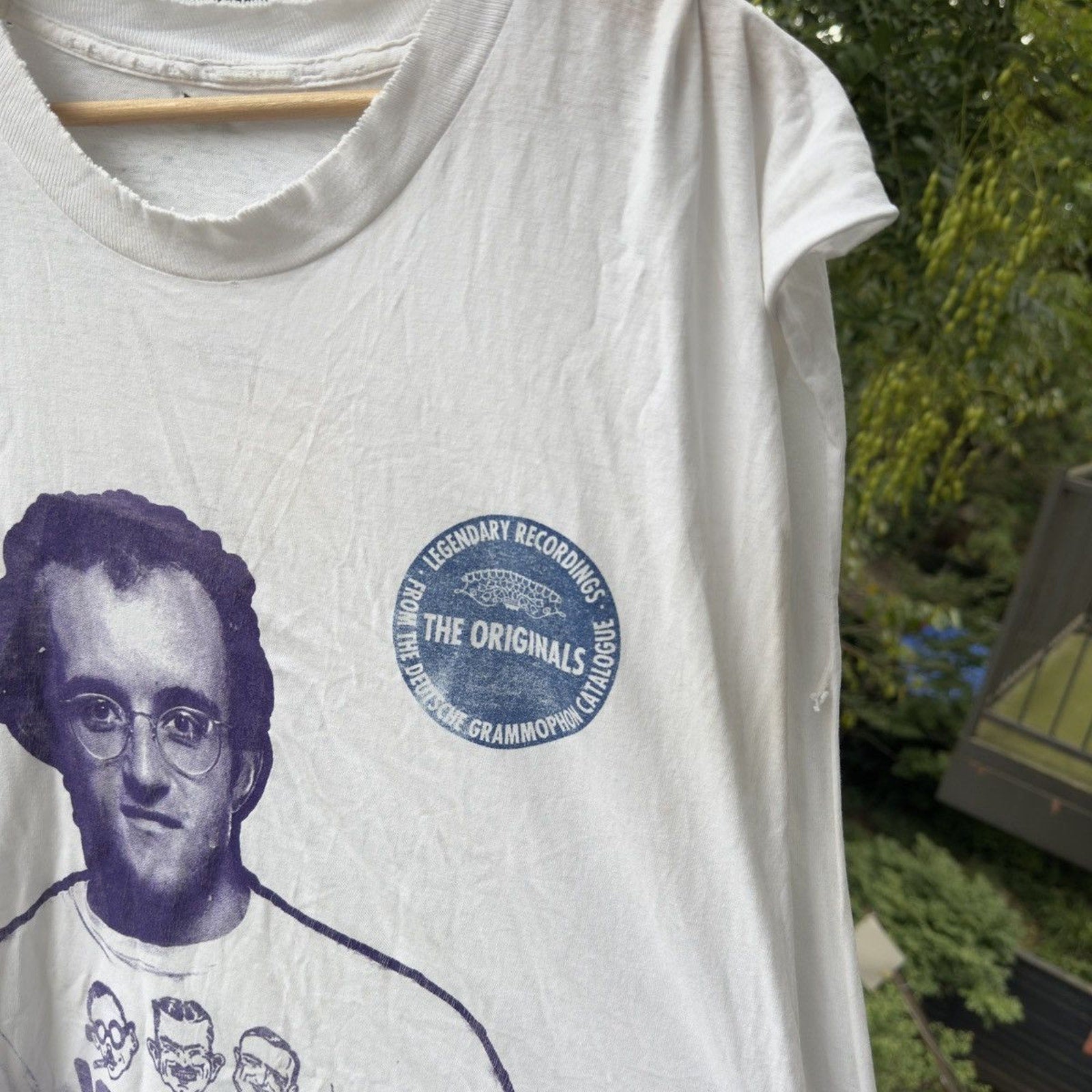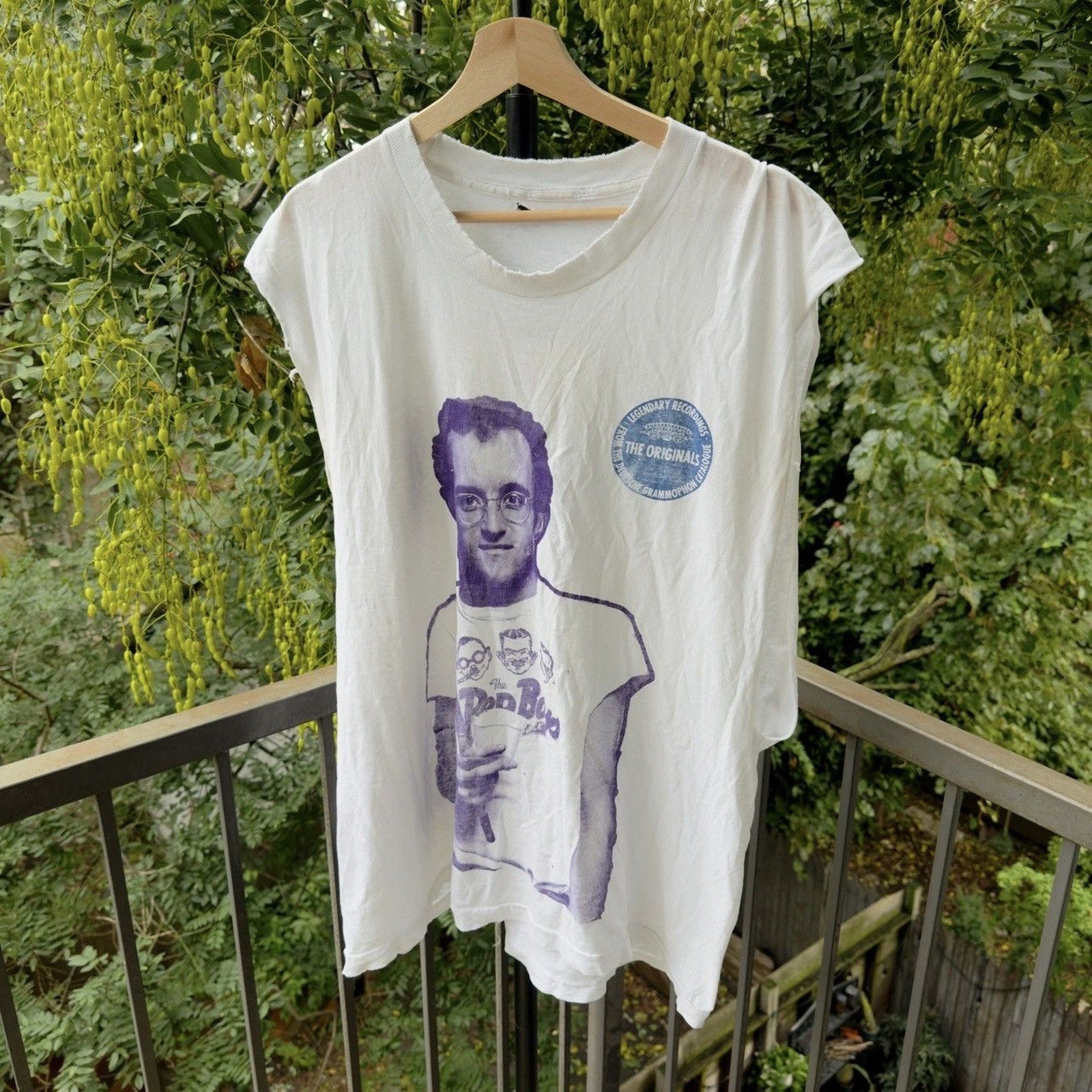 Perfect wear. thrashed, faded distressed. believe the Keith Haring print was custom added later on. looks amazing. really good the originals recording shirt. one of a kind