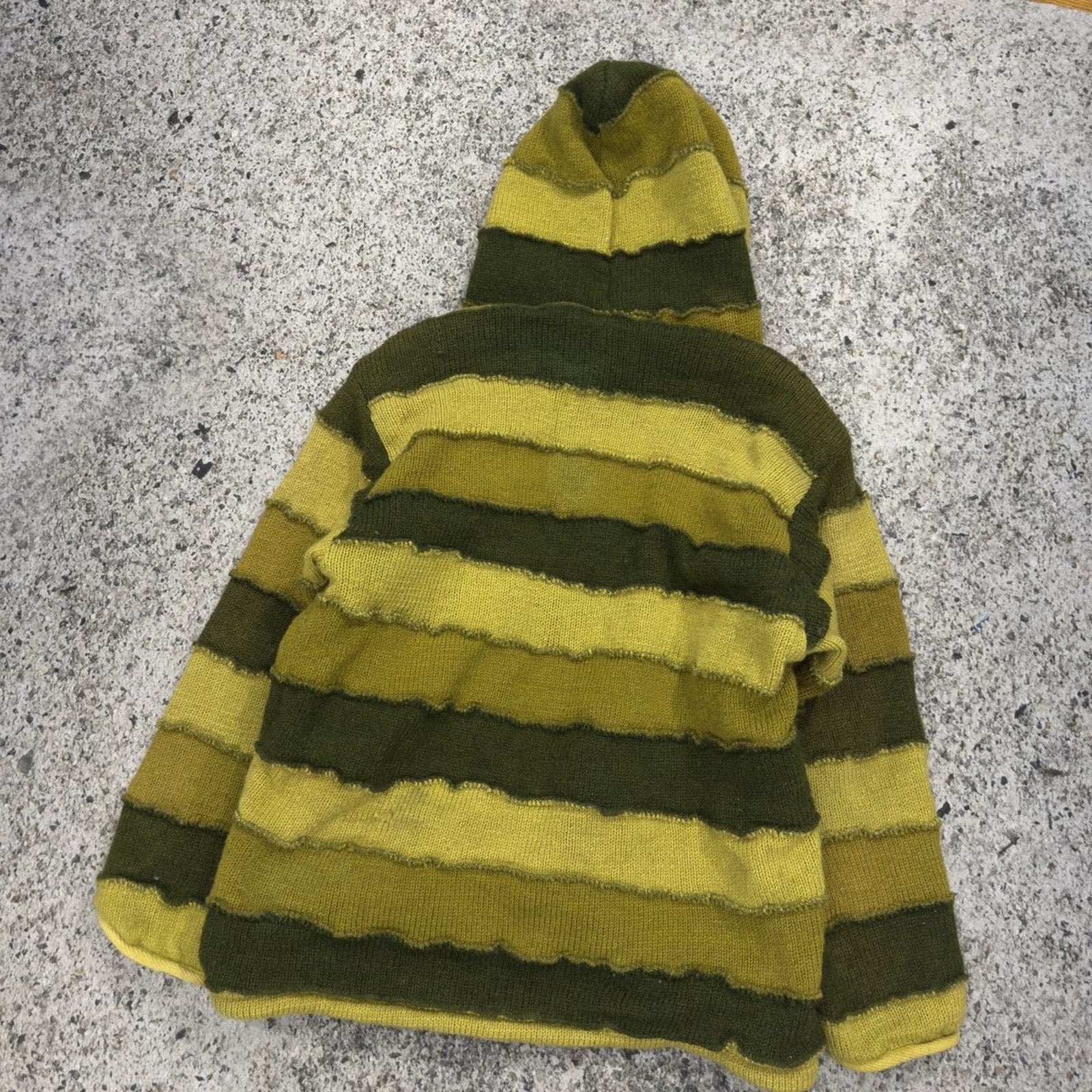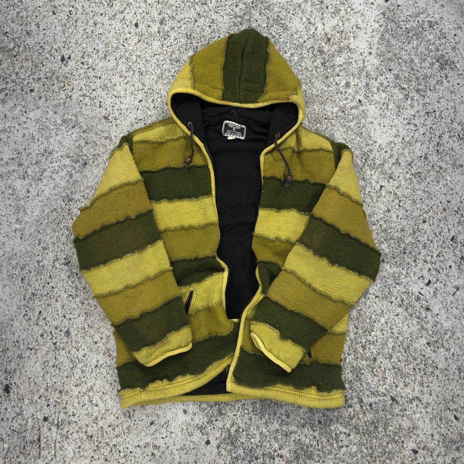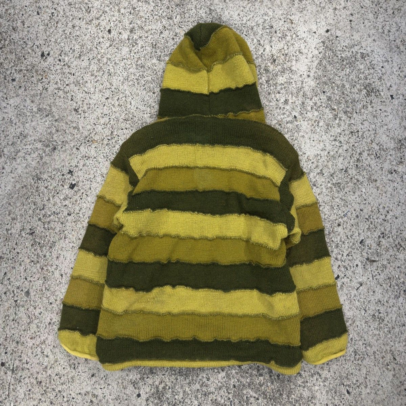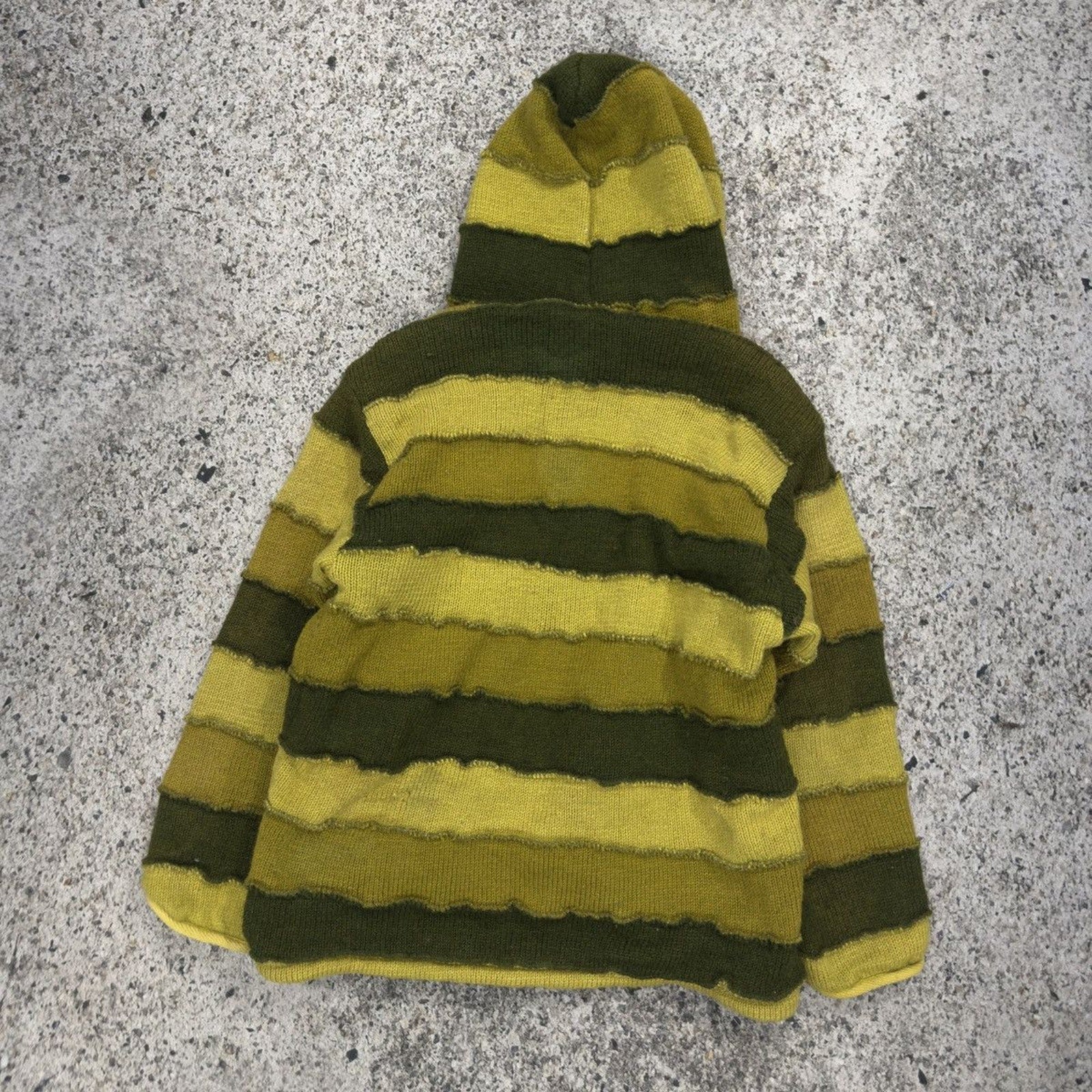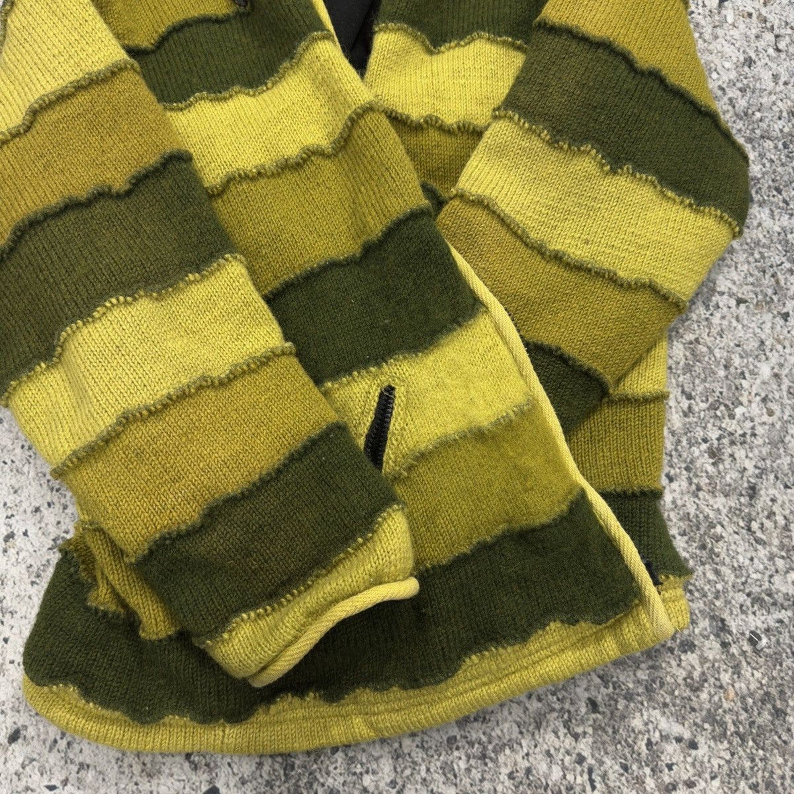1990s Wool Striped Green Heavy Chunky Knit Zip Up Hoodie