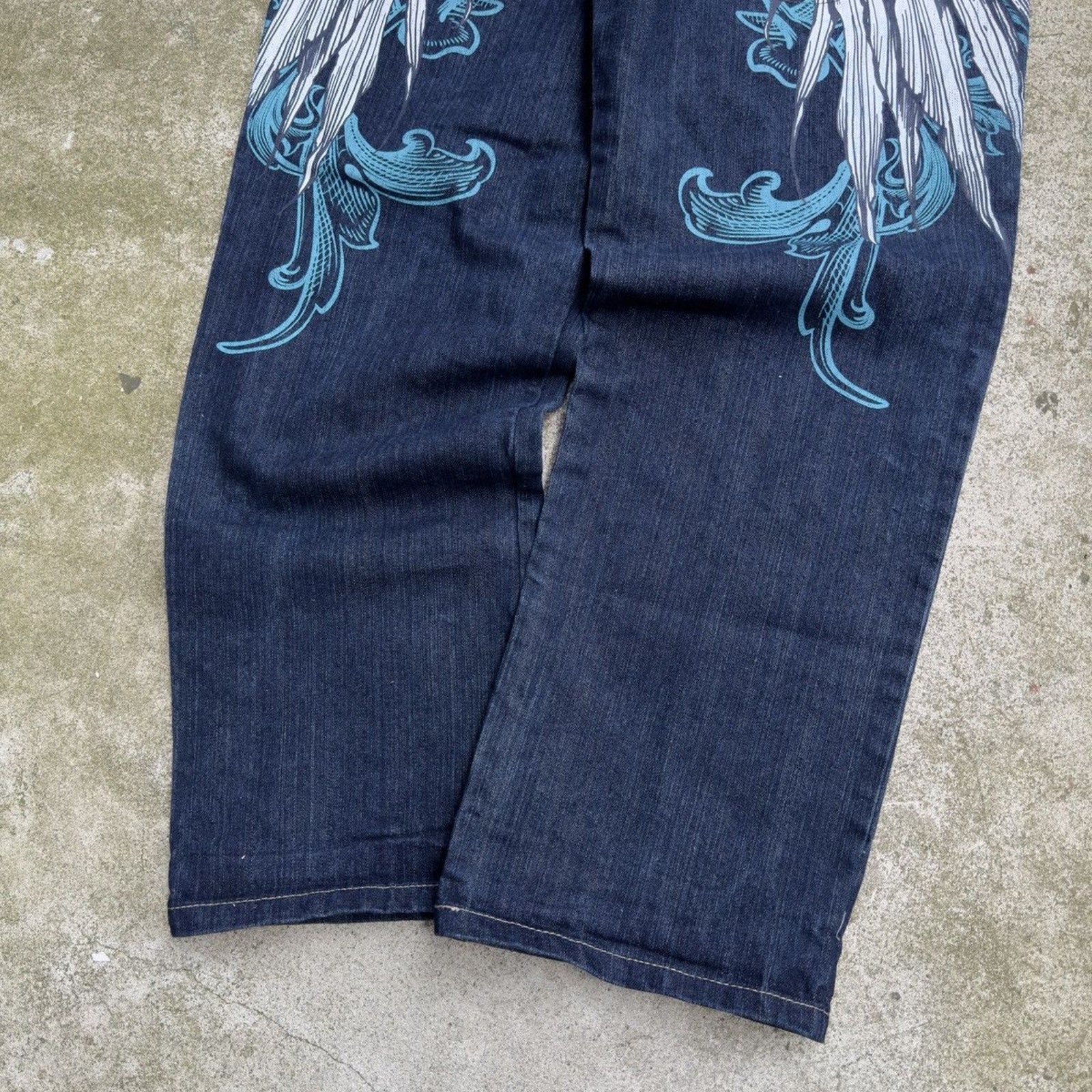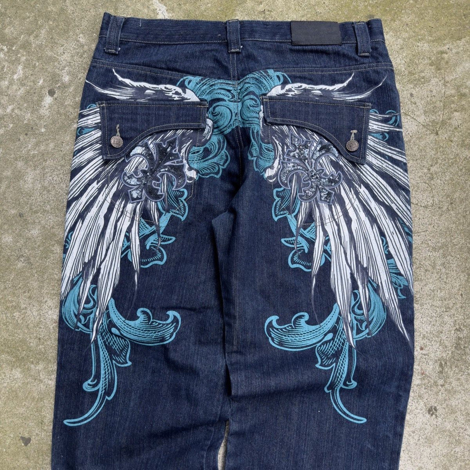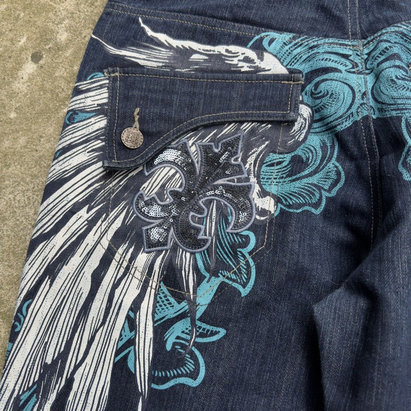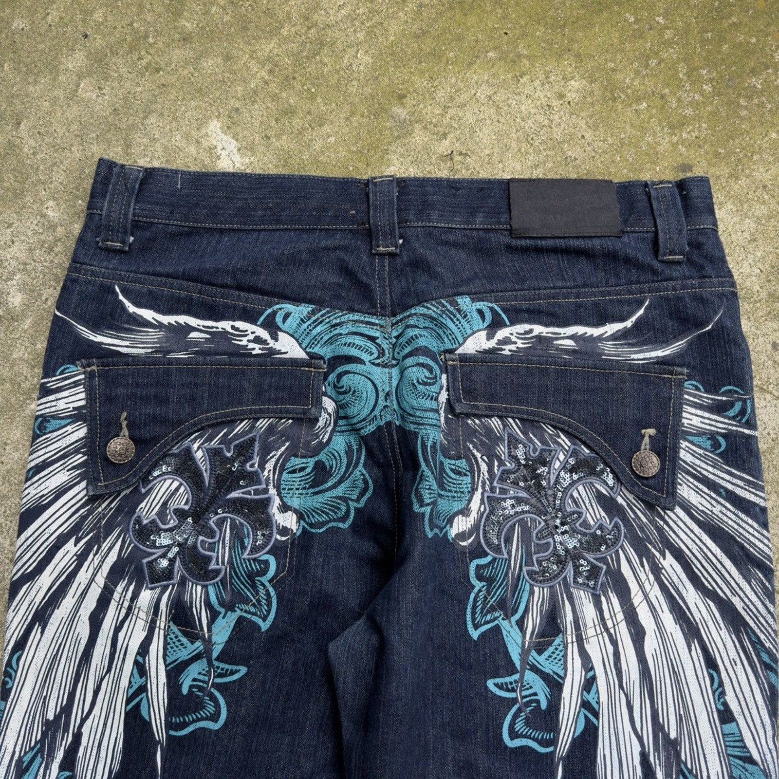 2000S Y2K RAW BLUE BAGGY CYBER WING DENIM SEQUIN JEANS