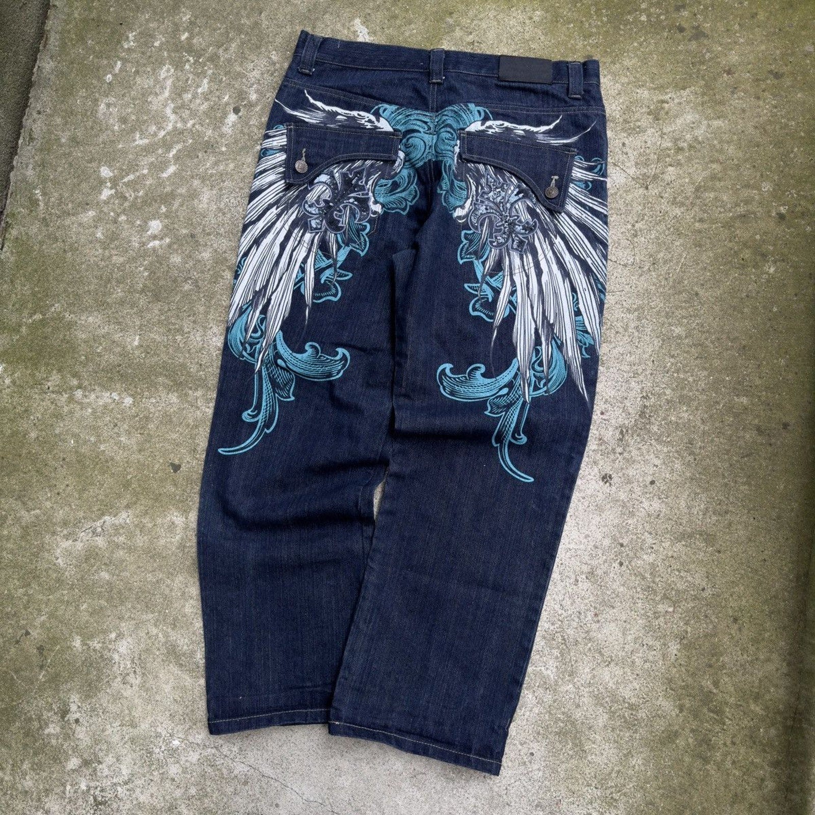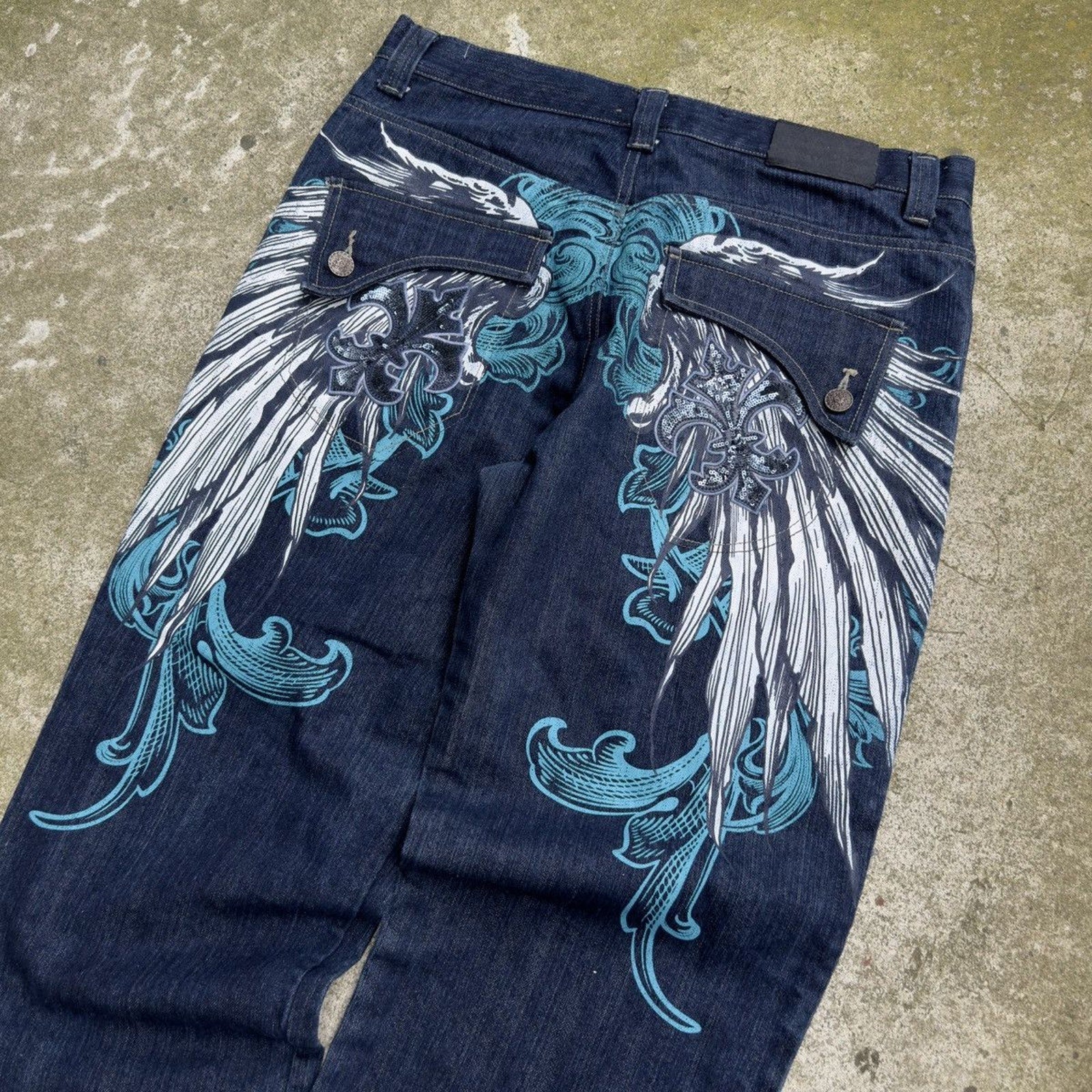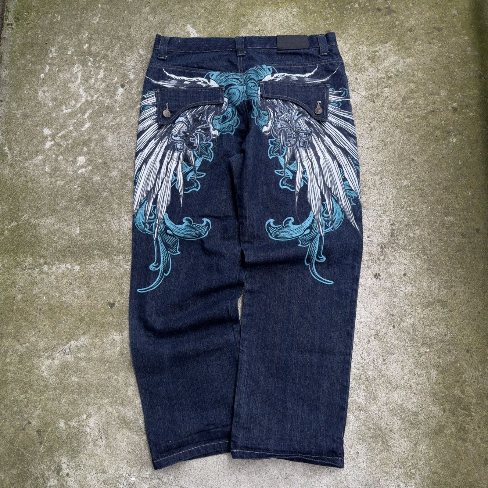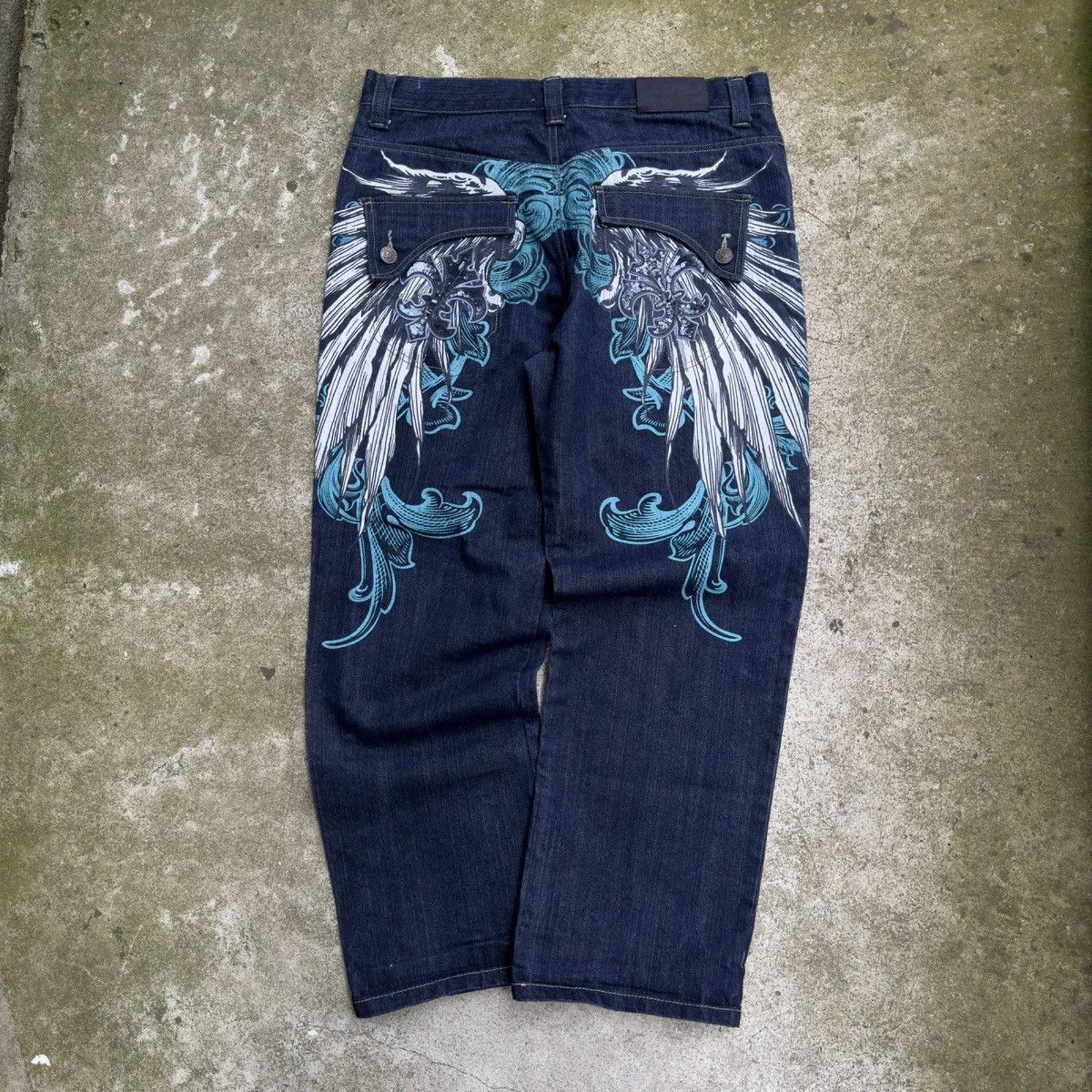 2000S Y2K RAW BLUE BAGGY CYBER WING DENIM SEQUIN JEANS