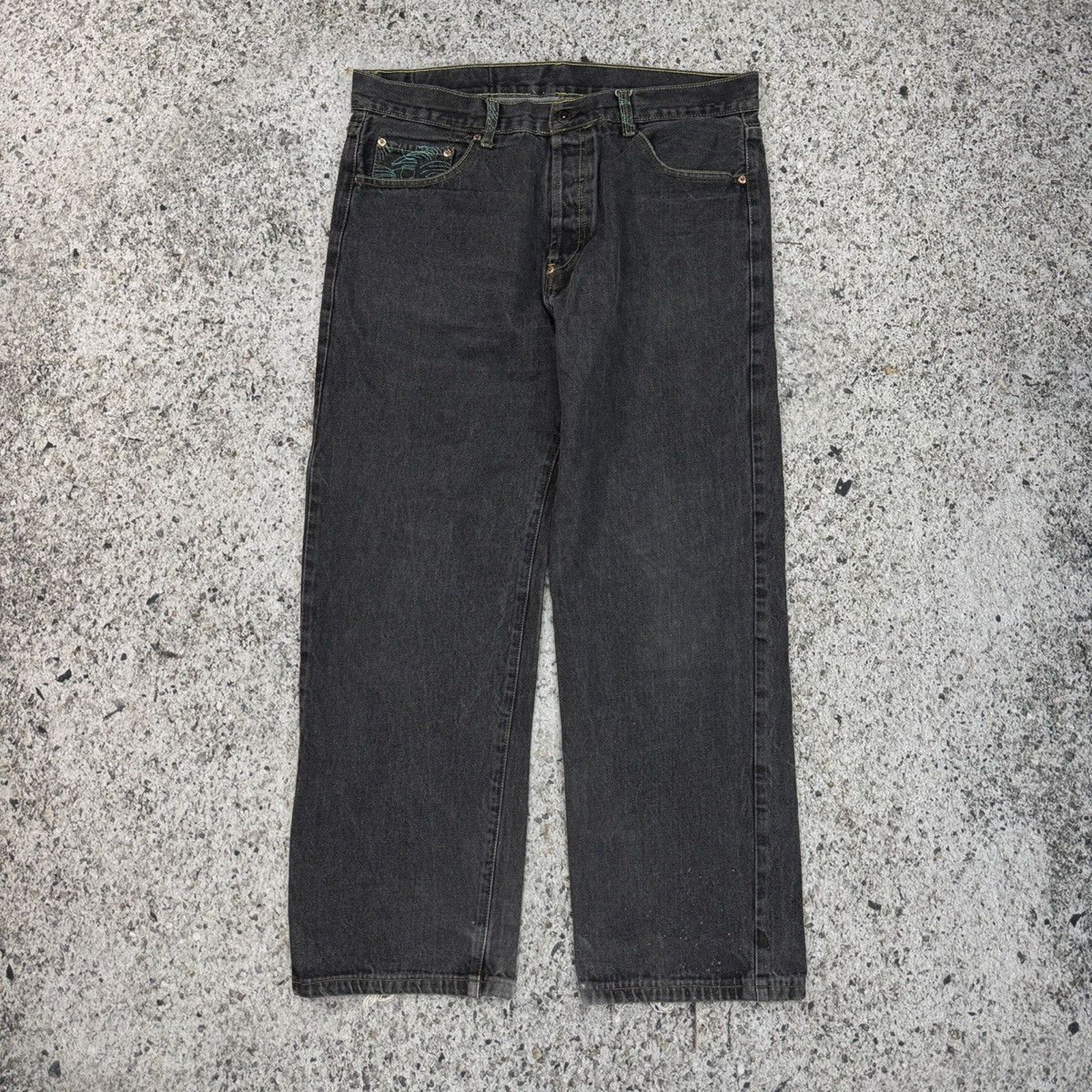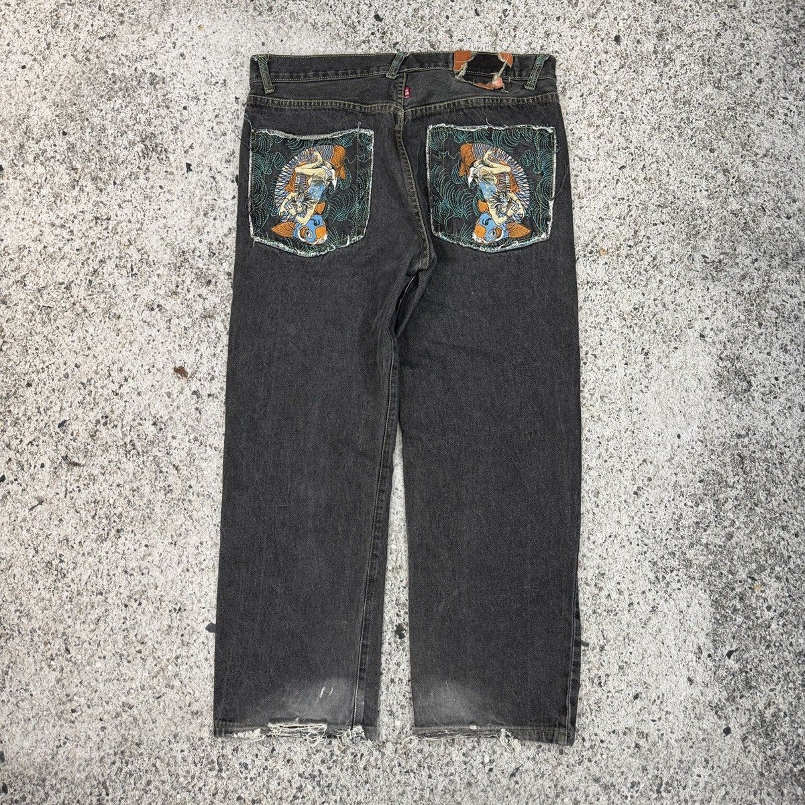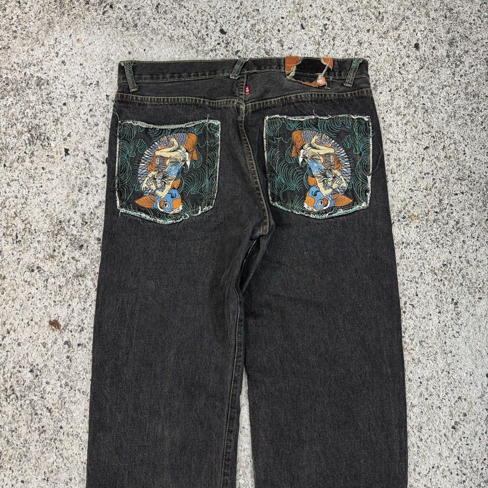 2000s Y2K Skater Embroidered Koi Fish Samurai Denim Jeans