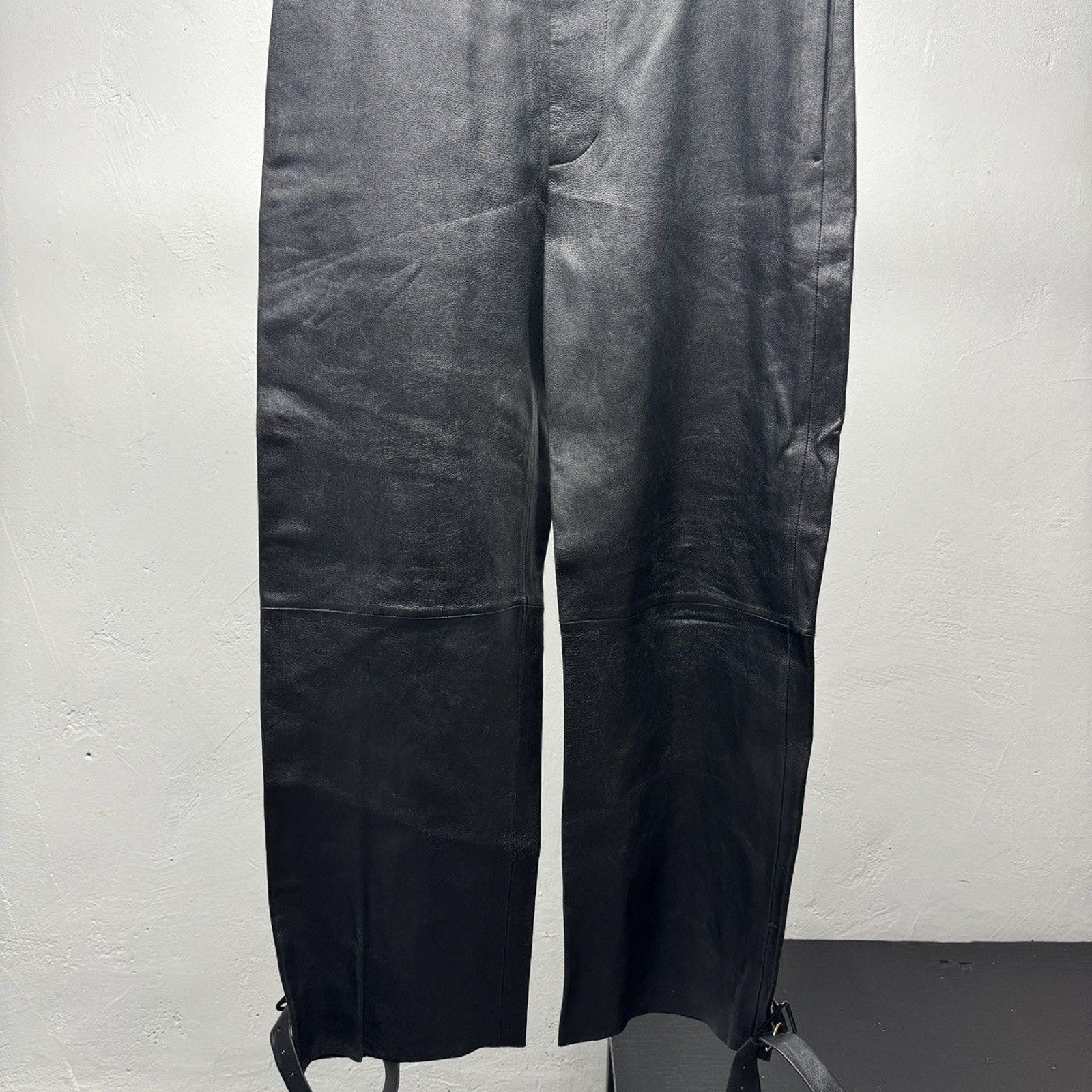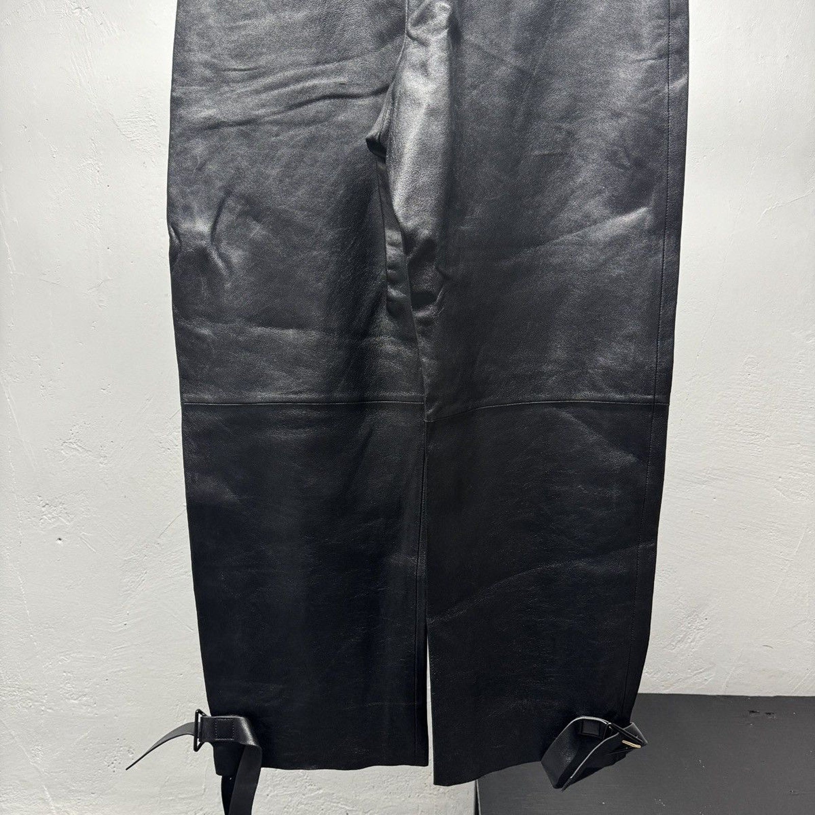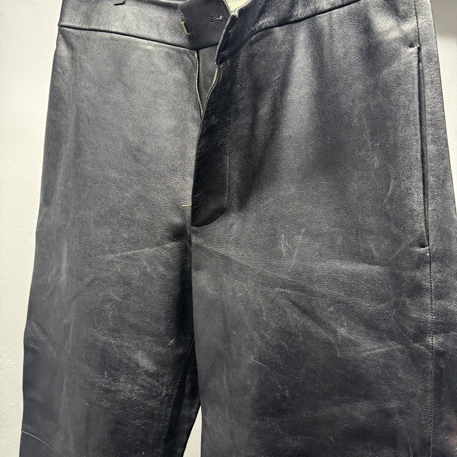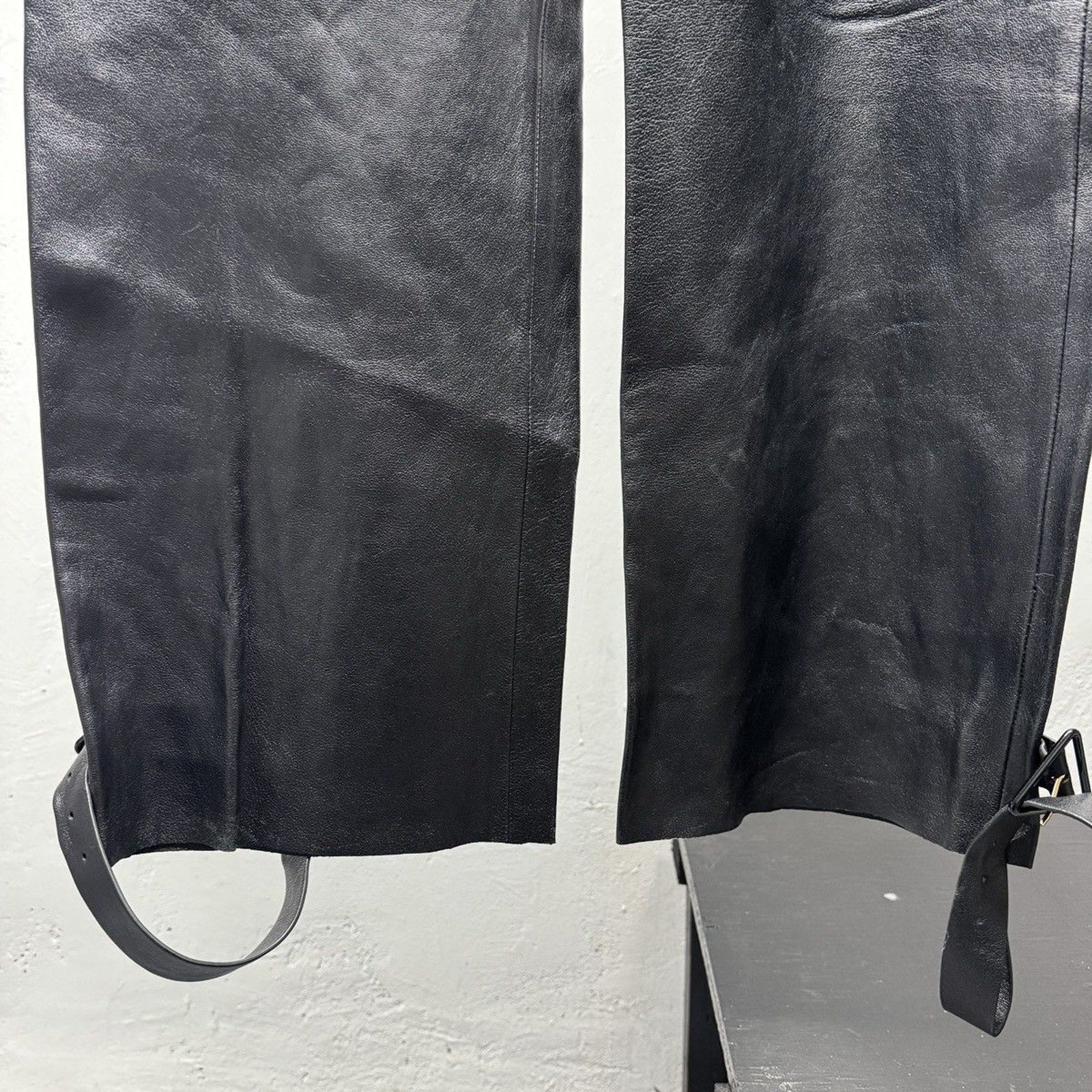 Great overall condition. Some slight scratches and marking on the leather. Crafted with vintage leather. looks great. Unisex pair, men's sizing. No belt loops. Pair has been hemmed by 4". Was originally a raw hem, still a raw hem, however buckle may not fit around opening with new hem work. My opinion, the buckles look better hanging to the side. Amazing pair. So good. Made in Italy. Retail $3950