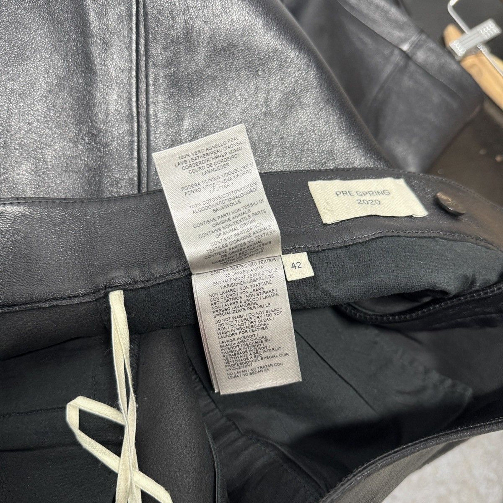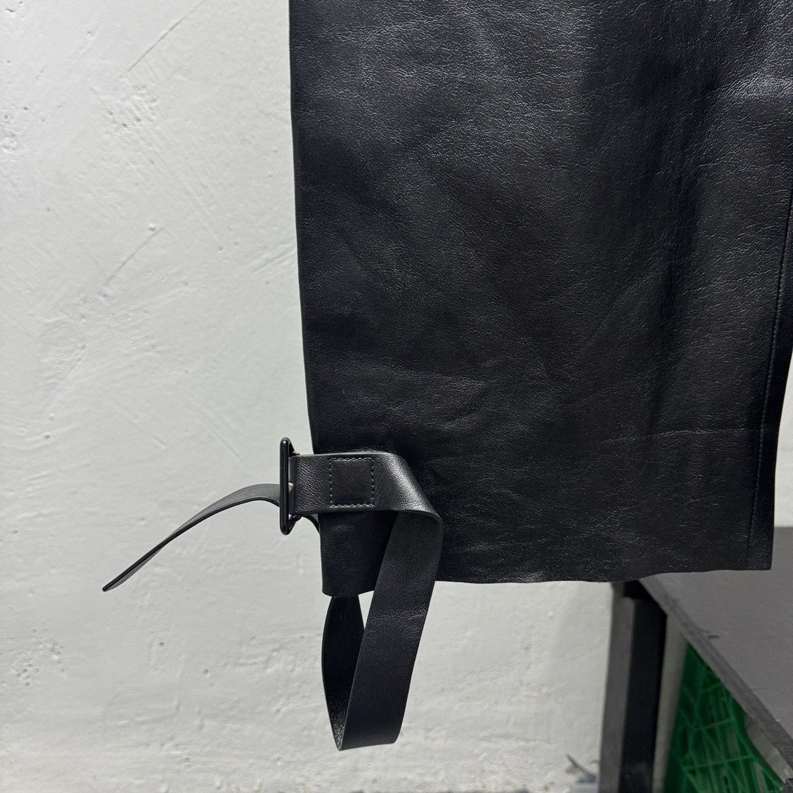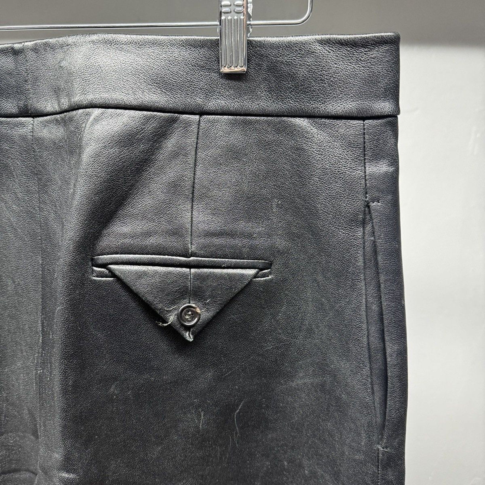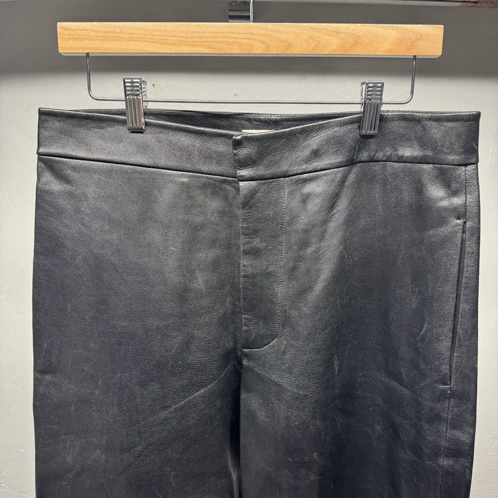 Great overall condition. Some slight scratches and marking on the leather. Crafted with vintage leather. looks great. Unisex pair, men's sizing. No belt loops. Pair has been hemmed by 4". Was originally a raw hem, still a raw hem, however buckle may not fit around opening with new hem work. My opinion, the buckles look better hanging to the side. Amazing pair. So good. Made in Italy. Retail $3950